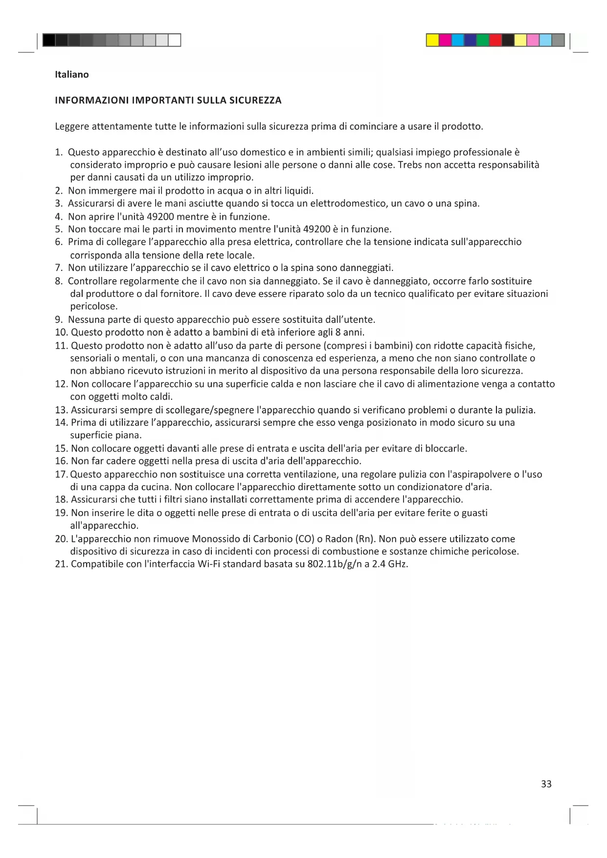 20. L'apparecchio non rimuove Monossido di Carbonio (CO) o Radon (Rn). Non può essere utilizzato come