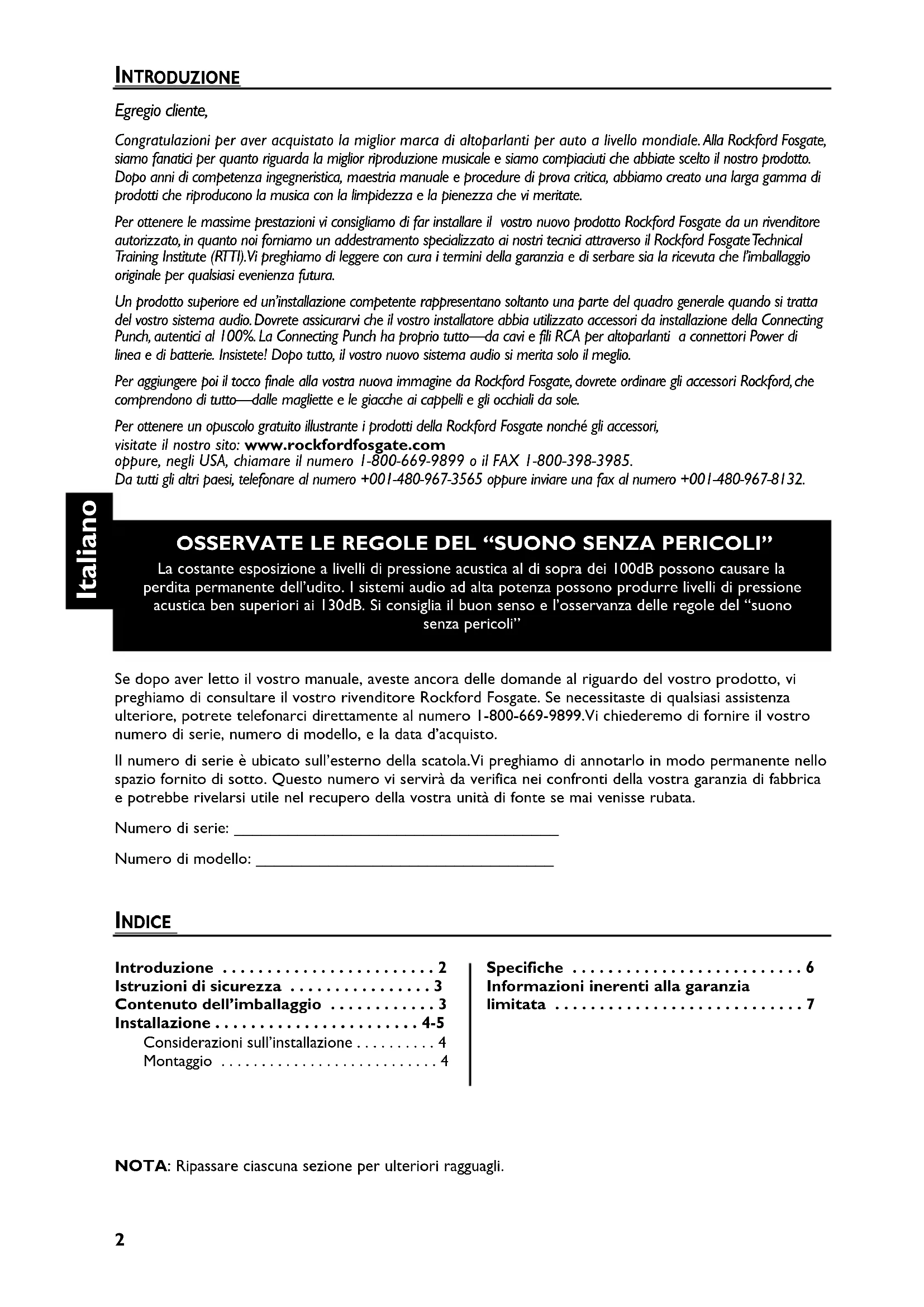 - INTR ODUZIONE INDICE Egregio cliente, Congratulazioni per aver acquistato la miglior marca di altoparlanti per auto a livello mondiale.Alla Rockford Fosgate, siamo fanatici per quanto riguarda la miglior riproduzione musicale e siamo compiaciuti che abbiate scelto il nostro prodotto. Dopo anni di competenza ingegneristica, maestria manuale e procedure di prova critica, abbiamo creato una larga gamma di prodotti che riproducono la musica con la limpidezza e la pienezza che vi meritate. Per ottenere le massime prestazioni vi consigliamo di far installare il vostro nuovo prodotto Rockford Fosgate da un rivenditore autorizzato, in quanto noi forniamo un addestramento specializzato ai nostri tecnici attraverso il Rockford Fosgate Technical Training Institute (RTTI).Vi preghiamo di leggere con cura i termini della garanzia e di serbare sia la ricevuta che l’imballaggio originale per qualsiasi evenienza futura. Un prodotto superiore ed un’installazione competente rappresentano soltanto una parte del quadro generale quando si tratta del vostro sistema audio. Dovrete assicurarvi che il vostro installatore abbia utilizzato accessori da installazione della Connecting Punch, autentici al 100%. La Connecting Punch ha proprio tutto—da cavi e fili RCA per altoparlanti a connettori Power di linea e di batterie. Insistete! Dopo tutto, il vostro nuovo sistema audio si merita solo il meglio. Per aggiungere poi il tocco finale alla vostra nuova immagine da Rockford Fosgate, dovrete ordinare gli accessori Rockford, che comprendono di tutto—dalle magliette e le giacche ai cappelli e gli occhiali da sole. Per ottenere un opuscolo gratuito illustrante i prodotti della Rockford Fosgate nonché gli accessori, visitate il nostro sito: www.rockfordfosgate.com oppure, negli USA, chiamare il numero 1-800-669-9899 o il FAX 1-800-398-3985. Da tutti gli altri paesi, telefonare al numero +001-480-967-3565 oppure inviare una fax al numero +001-480-967-8132. OSSERVATE LE REGOLE DEL “SUONO SENZA PERICOLI” La costante esposizione a livelli di pressione acustica al di sopra dei 100dB possono causare la perdita permanente dell’udito. I sistemi audio ad alta potenza possono produrre livelli di pressione acustica ben superiori ai 130dB. Si consiglia il buon senso e l’osservanza delle regole del “suono senza pericoli” NOTA: Ripassare ciascuna sezione per ulteriori ragguagli. Se dopo aver letto il vostro manuale, aveste ancora delle domande al riguardo del vostro prodotto, vi preghiamo di consultare il vostro rivenditore Rockford Fosgate. Se necessitaste di qualsiasi assistenza ulteriore, potrete telefonarci direttamente al numero 1-800-669-9899.Vi chiederemo di fornire il vostro numero di serie, numero di modello, e la data d’acquisto. Il numero di serie è ubicato sull’esterno della scatola.Vi preghiamo di annotarlo in modo permanente nello spazio fornito di sotto. Questo numero vi servirà da verifica nei confronti della vostra garanzia di fabbrica e potrebbe rivelarsi utile nel recupero della vostra unità di fonte se mai venisse rubata. Numero di serie: ____________________________________ Numero di modello: _________________________________ Introduzione p. 2