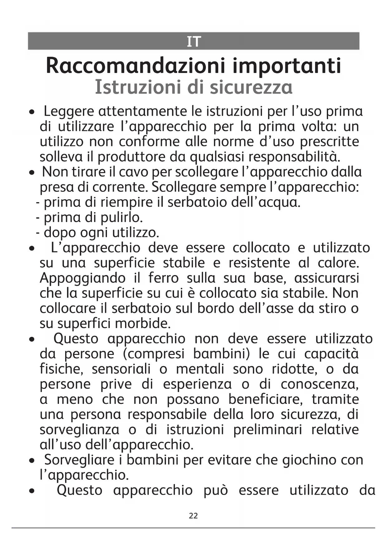 - Questo apparecchio può essere utilizzato da23 bambini di età superiore a 8 anni e da persone prive di esperienza o di conoscenza le cui capacità fisiche, sensoriali o mentali sono ridotte, purché istruite sull’utilizzo dell’apparecchio e informate sui rischi legati a un utilizzo scorretto. I bambini non devono giocare con l’apparecchio. Pulizia e manutenzione non deve essere fatta da bambini senza supervisione. Quando il ferro è acceso o in fase di raffreddamento, tenere il ferro e il cavo fuori dalla portata dei bambini di età inferiore a 8 anni.