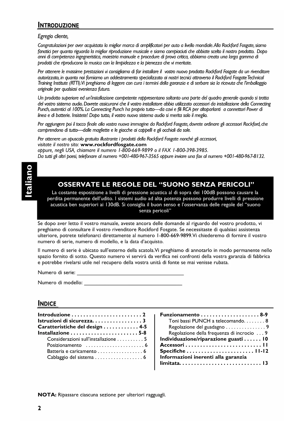 - Einschränkung von implizierten Garantien Implizierte Garantien, einschließlich von Garantien der Eignung für einen bestimmten Zweck und Marktgängigkeit, werden auf den Zeitraum der obenstehenden ausdrücklichen Garantie beschränkt. Manche Staaten erlauben Einschränkungen der Gültigkeit der implizierten Garantie nicht. Daher trifft diese Einschränkung nicht in allen Fällen zu. Inanspruchnahme des Kundendienstes Kontaktieren Sie bitte den Rockford Fosgate Vertragshändler, bei dem Sie dieses Produkt gekauft haben. Benötigen Sie zusätzliche Hilfe, rufen Sie den Kundendienst von Rockford unter 1-800-669-9899 an. Sie erhalten dann eine RA# (Rücksendungsautorisierungsnummer), um jegliche Produkte an Rockford Fosgate zurückzusenden. Sie sind für die Rücksendung des Produkts an Rockford verantwortlich. EU-Garantie Dieses Produkt entspricht den gültigen EU-Garantiebestimmungen. Sprechen Sie mit Ihrem Vertragshändler über die Einzelheiten.2 Italiano INTR ODUZIONE INDICE Egregio cliente, Congratulazioni per aver acquistato la miglior marca di amplificatori per auto a livello mondiale.Alla Rockford Fosgate, siamo fanatici per quanto riguarda la miglior riproduzione musicale e siamo compiaciuti che abbiate scelto il nostro prodotto. Dopo anni di competenza ingegneristica, maestria manuale e procedure di prova critica, abbiamo creato una larga gamma di prodotti che riproducono la musica con la limpidezza e la pienezza che vi meritate. Per ottenere le massime prestazioni vi consigliamo di far installare il vostro nuovo prodotto Rockford Fosgate da un rivenditore autorizzato, in quanto noi forniamo un addestramento specializzato ai nostri tecnici attraverso il Rockford Fosgate Technical Training Institute (RTTI).Vi preghiamo di leggere con cura i termini della garanzia e di serbare sia la ricevuta che l’imballaggio originale per qualsiasi evenienza futura. Un prodotto superiore ed un’installazione competente rappresentano soltanto una parte del quadro generale quando si tratta del vostro sistema audio. Dovrete assicurarvi che il vostro installatore abbia utilizzato accessori da installazione della Connecting Punch, autentici al 100%. La Connecting Punch ha proprio tutto—da cavi e fili RCA per altoparlanti a connettori Power di linea e di batterie. Insistete! Dopo tutto, il vostro nuovo sistema audio si merita solo il meglio. Per aggiungere poi il tocco finale alla vostra nuova immagine da Rockford Fosgate, dovrete ordinare gli accessori Rockford, che comprendono di tutto—dalle magliette e le giacche ai cappelli e gli occhiali da sole. Per ottenere un opuscolo gratuito illustrante i prodotti della Rockford Fosgate nonché gli accessori, visitate il nostro sito: www.rockfordfosgate.com oppure, negli USA, chiamare il numero 1-800-669-9899 o il FAX 1-800-398-3985. Da tutti gli altri paesi, telefonare al numero +001-480-967-3565 oppure inviare una fax al numero +001-480-967-8132. OSSERVATE LE REGOLE DEL “SUONO SENZA PERICOLI” La costante esposizione a livelli di pressione acustica al di sopra dei 100dB possono causare la perdita permanente dell’udito. I sistemi audio ad alta potenza possono produrre livelli di pressione acustica ben superiori ai 130dB. Si consiglia il buon senso e l’osservanza delle regole del “suono senza pericoli” NOTA: Ripassare ciascuna sezione per ulteriori ragguagli. Se dopo aver letto il vostro manuale, aveste ancora delle domande al riguardo del vostro prodotto, vi preghiamo di consultare il vostro rivenditore Rockford Fosgate. Se necessitaste di qualsiasi assistenza ulteriore, potrete telefonarci direttamente al numero 1-800-669-9899.Vi chiederemo di fornire il vostro numero di serie, numero di modello, e la data d’acquisto. Il numero di serie è ubicato sull’esterno della scatola.Vi preghiamo di annotarlo in modo permanente nello spazio fornito di sotto. Questo numero vi servirà da verifica nei confronti della vostra garanzia di fabbrica e potrebbe rivelarsi utile nel recupero della vostra unità di fonte se mai venisse rubata. Numero di serie: ____________________________________ Numero di modello: _________________________________ Introduzione p. 2
