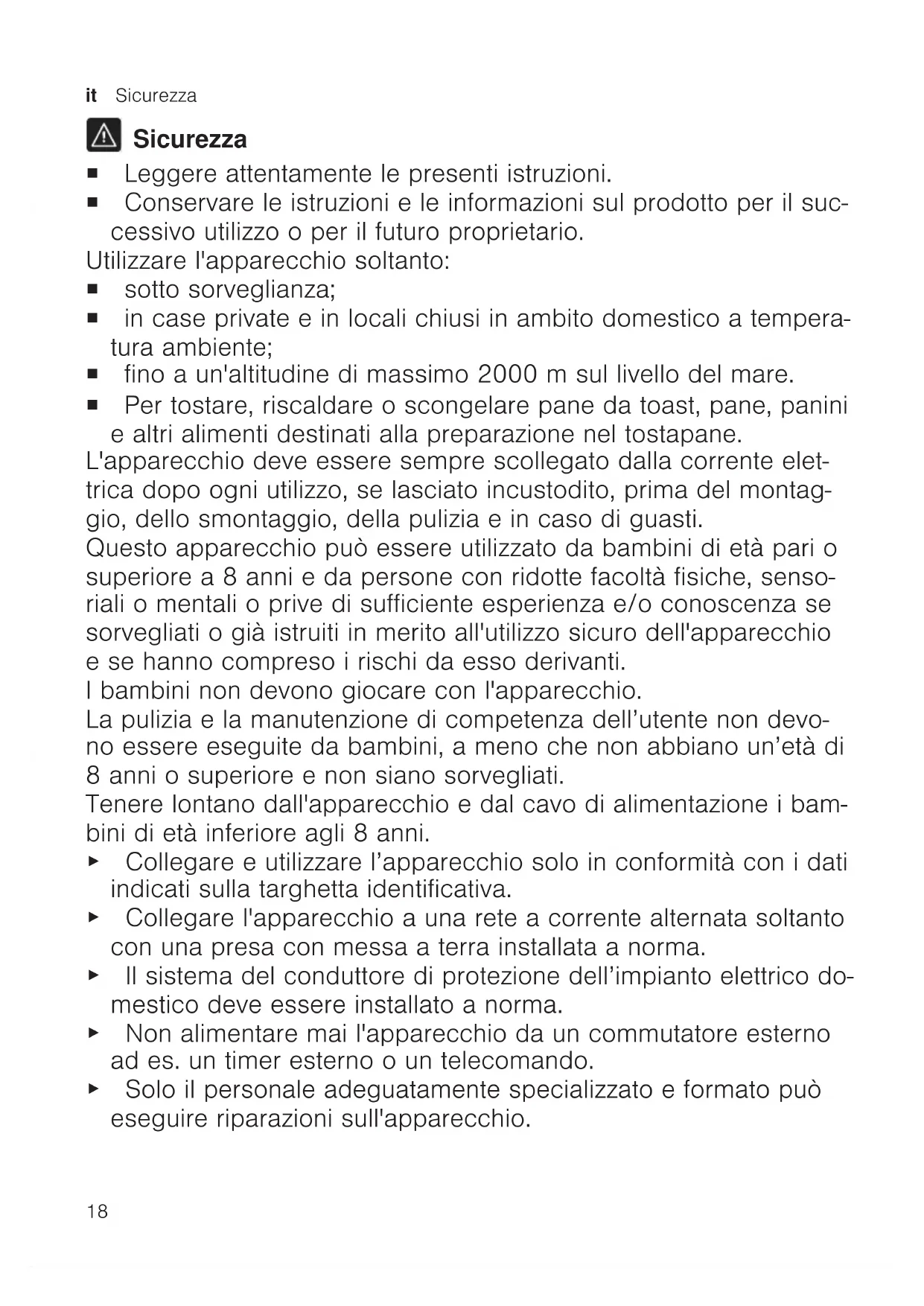 Sicurezza ¡ Leggere attentamente le presenti istruzioni. ¡ Conservare le istruzioni e le informazioni sul prodotto per il suc- cessivo utilizzo o per il futuro proprietario. Utilizzare l'apparecchio soltanto: ¡ sotto sorveglianza; ¡ in case private e in locali chiusi in ambito domestico a tempera- tura ambiente; ¡ fino a un'altitudine di massimo 2000m sul livello del mare. ¡ Per tostare, riscaldare o scongelare pane da toast, pane, panini e altri alimenti destinati alla preparazione nel tostapane. L'apparecchio deve essere sempre scollegato dalla corrente elet- trica dopo ogni utilizzo, se lasciato incustodito, prima del montag- gio, dello smontaggio, della pulizia e in caso di guasti. Questo apparecchio può essere utilizzato da bambini di età pari o superiore a 8 anni e da persone con ridotte facoltà fisiche, senso- riali o mentali o prive di sufficiente esperienza e/o conoscenza se sorvegliati o già istruiti in merito all'utilizzo sicuro dell'apparecchio e se hanno compreso i rischi da esso derivanti. I bambini non devono giocare con l'apparecchio. La pulizia e la manutenzione di competenza dell’utente non devo- no essere eseguite da bambini, a meno che non abbiano un’età di 8 anni o superiore e non siano sorvegliati. Tenere lontano dall'apparecchio e dal cavo di alimentazione i bam- bini di età inferiore agli 8 anni. ▶ Collegare e utilizzare l’apparecchio solo in conformità con i dati indicati sulla targhetta identificativa. ▶ Collegare l'apparecchio a una rete a corrente alternata soltanto con una presa con messa a terra installata a norma. ▶ Ilsistema delconduttore diprotezione dell’impianto elettrico do- mestico deve essere installato anorma. ▶ Non alimentare mai l'apparecchio da un commutatore esterno ad es. un timer esterno o un telecomando. ▶ Solo il personale adeguatamente specializzato e formato può eseguire riparazioni sull'apparecchio.Sicurezza it
