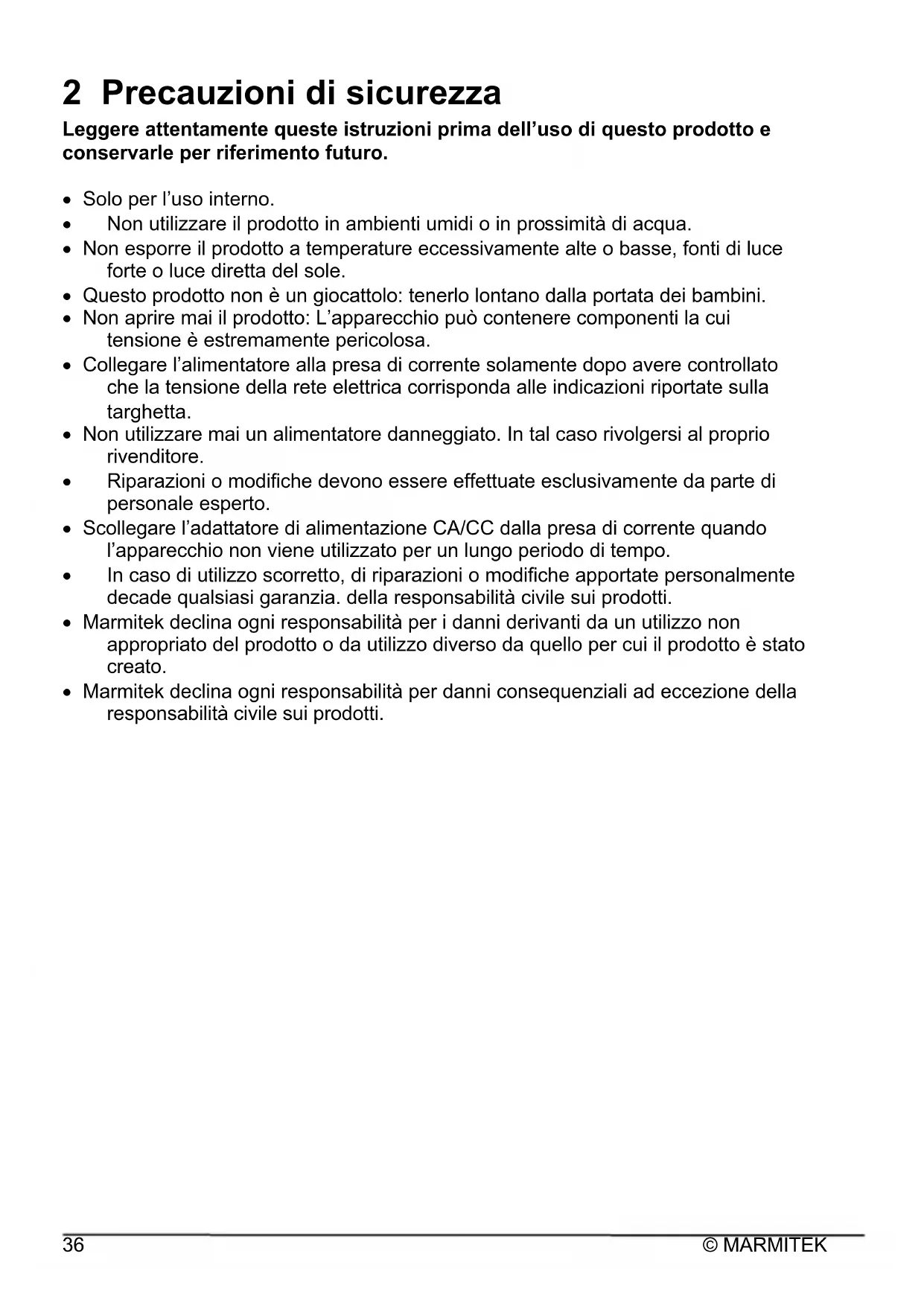 Marmitek è un marchio commerciale di Germatron BV. Split 614 UHD 2.0™ è un marchio commerciale di Marmitek BV. Tutti i diritti riservati. Marmitek si è impegnata perché le informazioni contenute in questo manuale fossero il più possibile precise. Marmitek declina ogni responsabilità per eventuali errori di stampa. I diritti d'autore e tutti gli altri diritti di proprietà intellettuale sul contenuto (inclusi ma non limitati a numeri di modelli, software, audio, video, testi e fotografie) spettano a Marmitek BV. È strettamente proibito ogni uso del Contenuto, incluse senza limitazioni la distribuzione, riproduzione, modifica, pubblicazione o trasmissione senza previa autorizzazione scritta da parte di Marmitek. Tutti i diritti d’autore e altri diritti di proprietà intellettuale su tutte le riproduzioni devono essere conservati. I nomi di altre società e prodotti qui menzionati potrebbero essere marchi delle rispettive società. La citazione di prodotti di terze parti è a solo scopo informativo e non costituisce alcun impegno o raccomandazione. Marmitek declina ogni responsabilità riguardo l’uso e le prestazioni di questi prodotti.