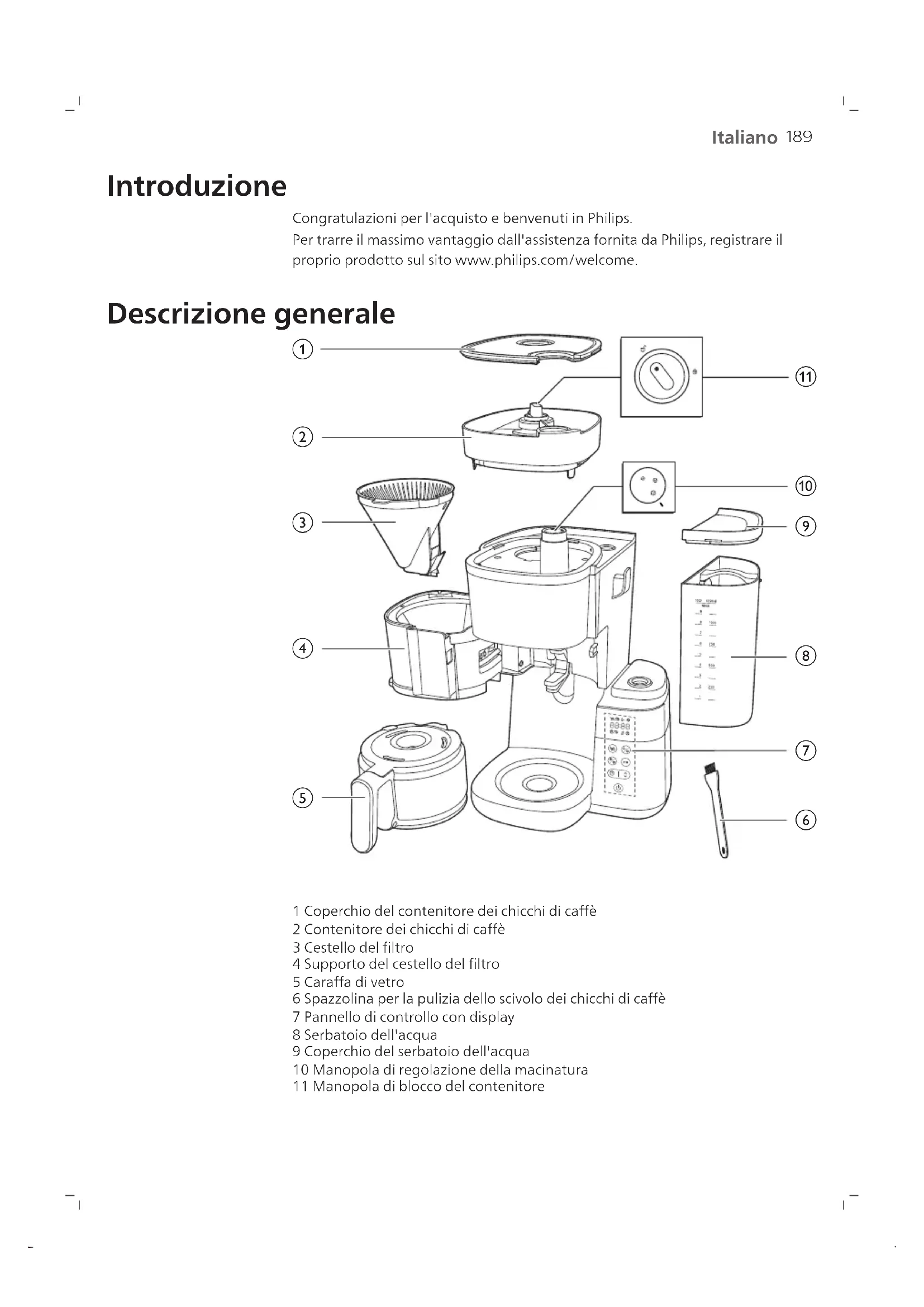 1 Coperchio del contenitore dei chicchi di caffè 2 Contenitore dei chicchi di caffè 3 Cestello del filtro 4 Supporto del cestello del filtro 5 Caraffa di vetro 6 Spazzolina per la pulizia dello scivolo dei chicchi di caffè 7 Pannello di controllo con display 8 Serbatoio dell'acqua 9 Coperchio del serbatoio dell'acqua 10 Manopola di regolazione della macinatura 11 Manopola di blocco del contenitore190 Italiano Pannello di controllo Pulsante di accensione Pulsante del timer e pulsante freccia per la regolazione dell'ora Pulsante di avvio/pausa Pulsante per la pulizia Pulsante pre-macinato e per l'intensità del caffè Pulsante di selezione delle tazze Icona del display Numero di tazze Modalità mantenimento della temperatura Caffè pre-macinato Intensità del caffè Rimozione del calcare Avviso di pulizia manuale Riserva di acqua insufficiente Timer191 Italiano Visualizzazione dell'ora Le prime due cifre rappresentano le ore, mentre le ultime due rappresentano i minuti. Ruotare la manopola in posizione di sblocco, quindi rimuovere il contenitore dei chicchi di caffè dall'apparecchio. Questa manopola consente di selezionare la macinatura del caffè; le dimensioni maggiori indicano una macinatura più grossolana. Modalità caraffa La modalità caraffa offre la funzione antigoccia. Nota: il processo di erogazione non si interrompe quando viene rimossa la caraffa. Se la caraffa non viene riposizionata nell'apparecchio entro 20 secondi, il caffè fuoriesce dal cestello del filtro. Modalità tazza Spostare manualmente la manopola dalla modalità tazza alla modalità caraffa per attivare la funzione antigoccia ed evitare sgocciolamenti una volta terminato il ciclo di erogazione. Nota: una tazza in ceramica fredda assorbe calore sottraendolo al caffè; utilizzare una tazza preriscaldata con acqua calda. Importante Avviso