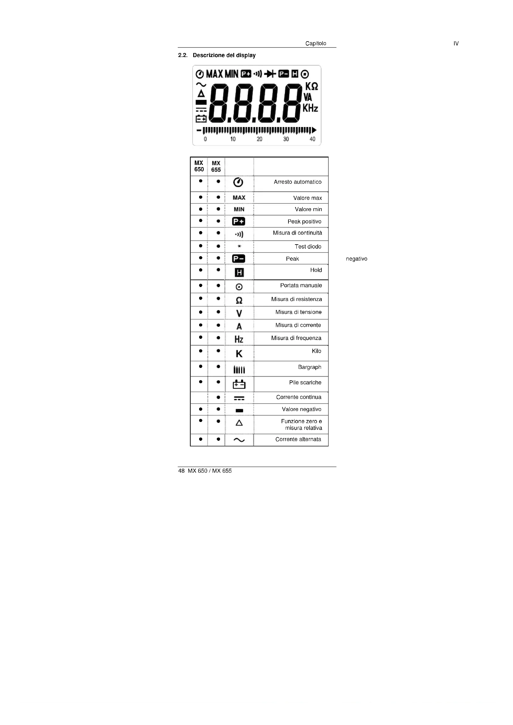 - In tensione Portata Fascia Risol. Precisione Sensibilità 4000 Hz da 10 a 3999 Hz 1 Hz 0,1% L ± 1pt 5 Vrms 10 kHz da 4,00 a 10,00 kHz 10 Hz 0,1% L ± 1pt 10 Vrms 5.3. Sicurezza CEI 61010-1 e CEI 61010-2-032 : - Isolamento: classe II - Grado d’inquinamento: 2 - Altitudine : < 2000 m - Categoria di impianto : CAT III 600 VCapitolo IV MX 650 / MX 655 57 5.4. Informazioni generali Display digitale 3 ¾ digit a cristalli liquidi con lettura maxi di 3999 punti Display analogico Bargraph di 42 segmenti Polarità Se un segnale negativo è applicato, appare il simbolo
