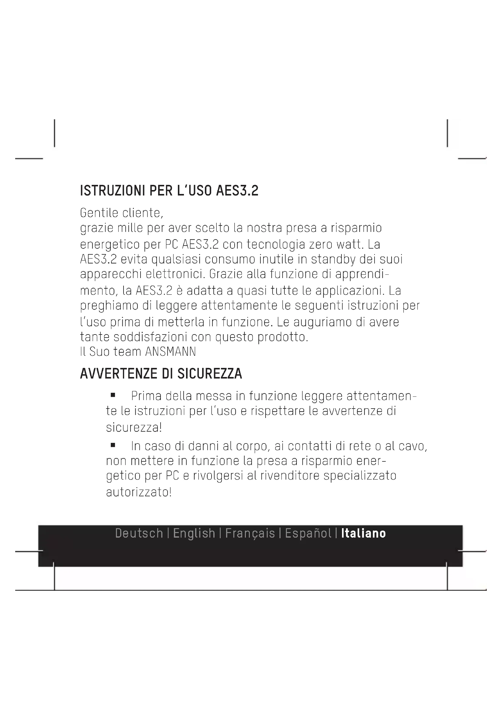 solito, premere prima il tasto rosso di funzionamento per ca. 3 secondi. Ora, tutti gli apparecchi collegati alla presa a risparmio energetico per PC sono pronti al funzio- namento. Il tasto di funzionamento si illumina in modo continuo di colore rosso non appena uno degli apparecchi collegati viene messo in funzionamento dalla modalità standby. Dopo aver riportato l’apparecchio in modalità standby, la presa a risparmio energetico per PC lo riconosce e passa in modalità spegnimento, ovvero il tasto di funzionamento lampeggia di colore rosso e dopo ca. 1 minuto avviene automaticamente lo scollegamento dalla rete. Deutsch | English | Français | Español | ItalianoINDICAZIONI AMBIENTALI Non gettare in nessun caso il prodotto nei rifiuti domestici al termine della sua vita utile. Smaltirlo attraverso un’azienda di smaltimento autorizzata o attraverso la struttura comuna- le preposta. Rispettare le normative attualmente in vigore. In caso di dubbi, contattare la struttura di smaltimento compe- tente. Smaltire in modo ecologico tutti i materiali d’imballo. MANUTENZIONE/CURA Per assicurare un funzionamento perfetto della presa a risparmio energetico per PC, mantenere i contatti privi di sporco. Effettuare la pulizia solo con la spina estratta utiliz- zando un panno asciutto. DATI TECNICI Collegamento: 230V AC / 50Hz Carico: max. 2500W / 10A Potenza in standby apprendibile: max. 70W Consumo di corrente: 0W in standby (dopo lo scollegamento dalla rete) Deutsch | English | Français | Español | ItalianoESCLUSIONI DI RESPONSABILITÀ Le informazioni contenute in queste istruzioni per l’uso possono essere modificate senza preavviso. ANSMANN non si assume alcuna responsabilità per danni diretti, indiretti, casuali o di altra natura o per danni conseguenti, derivanti dall’uso o dall’impiego delle informazioni contenute in ques- te istruzioni per l’uso.