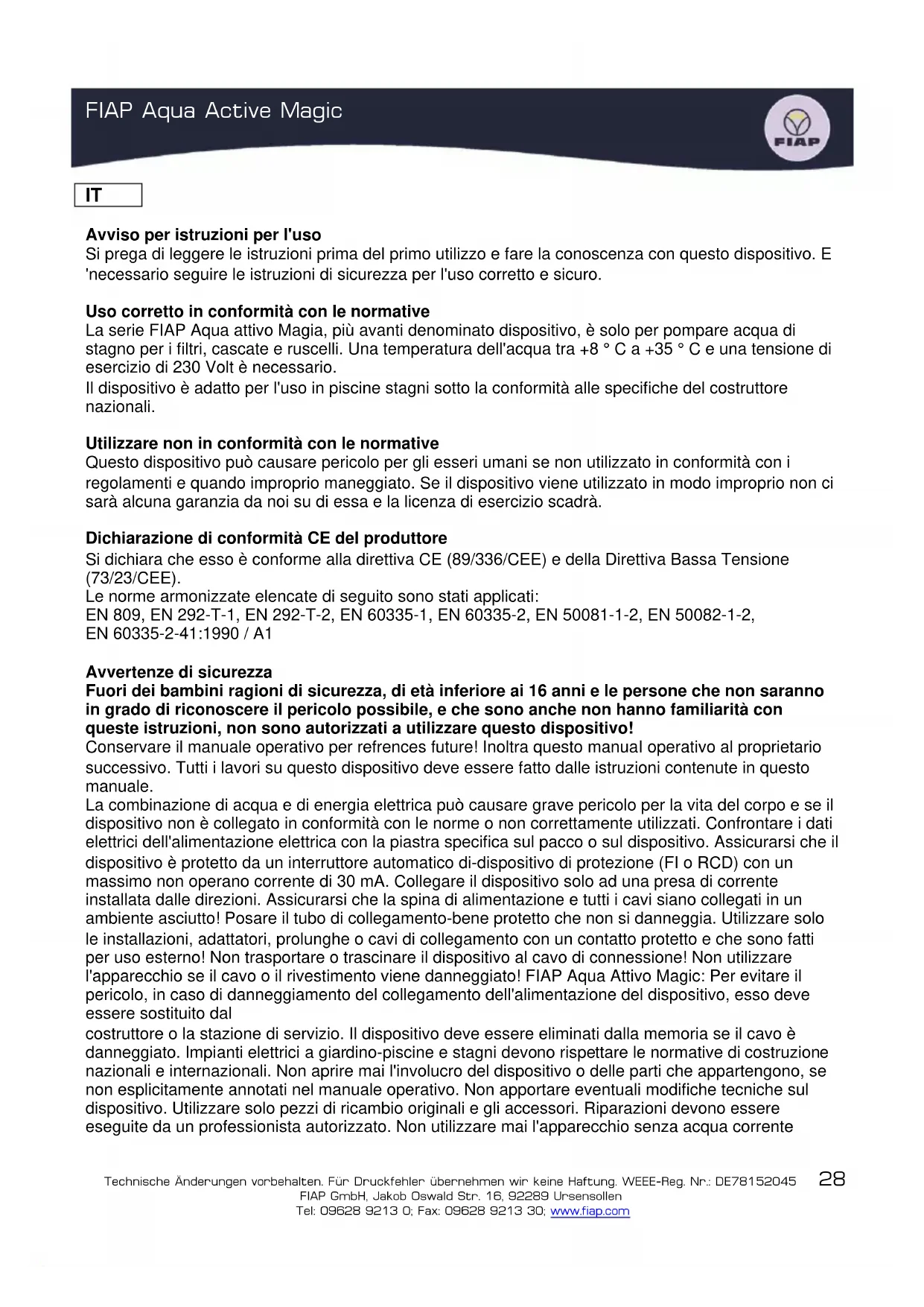 Technische Änderungen vorbehalten. Für Druckfehler übernehmen wir keine Haftung. WEEE-Reg. Nr.: DE78152045 32 FIAP GmbH, Jakob Oswald Str. 16, 92289 Ursensollen Tel: 09628 9213 0; Fax: 09628 9213 30; www.fiap.com Parti di usura L'operazione di unità, il cuscinetto e le guarnizioni ad anello di scorrimento sono soggette ad usura non sono coperti dalla garanzia. Conservazione e svernano Il dispositivo deve essere disinstallato quando c'è gelo. Pulire bene e cercare danni sul dispositivo. Per la conservazione svuotare il dispositivo completamente e tenerlo al riparo dal gelo. Anche svuotare anche al gelo in via di estinzione tubi. Il connettore a spina non deve mai essere allagata! Smaltimento Il dispositivo deve essere smaltito dalle leggi nazionali. Chiedete al vostro rivenditore specializzato.FIAP Aqua Active Magic