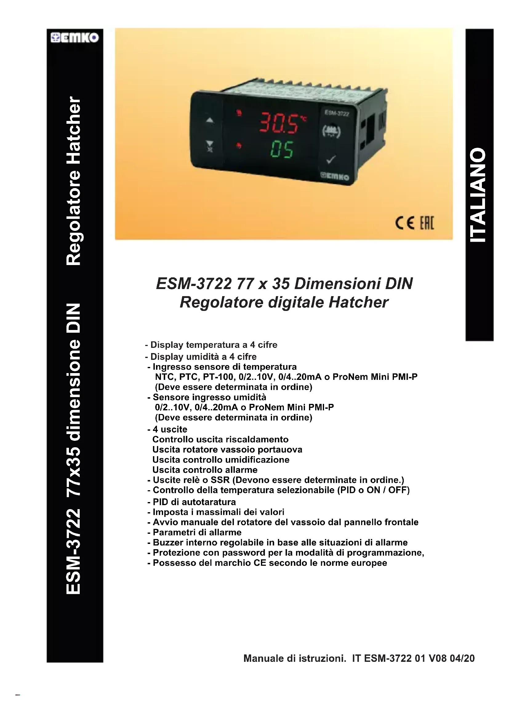 - (Sensor de temperatura y humedad PT100 con cable de 2,5 mt)ITALIANO ESM-3722 77x35 dimensione DIN Regolatore Hatcher - Display temperatura a 4 cifre - Display umidità a 4 cifre - Ingresso sensore di temperatura NTC, PTC, PT-100, 0/2 p. 10