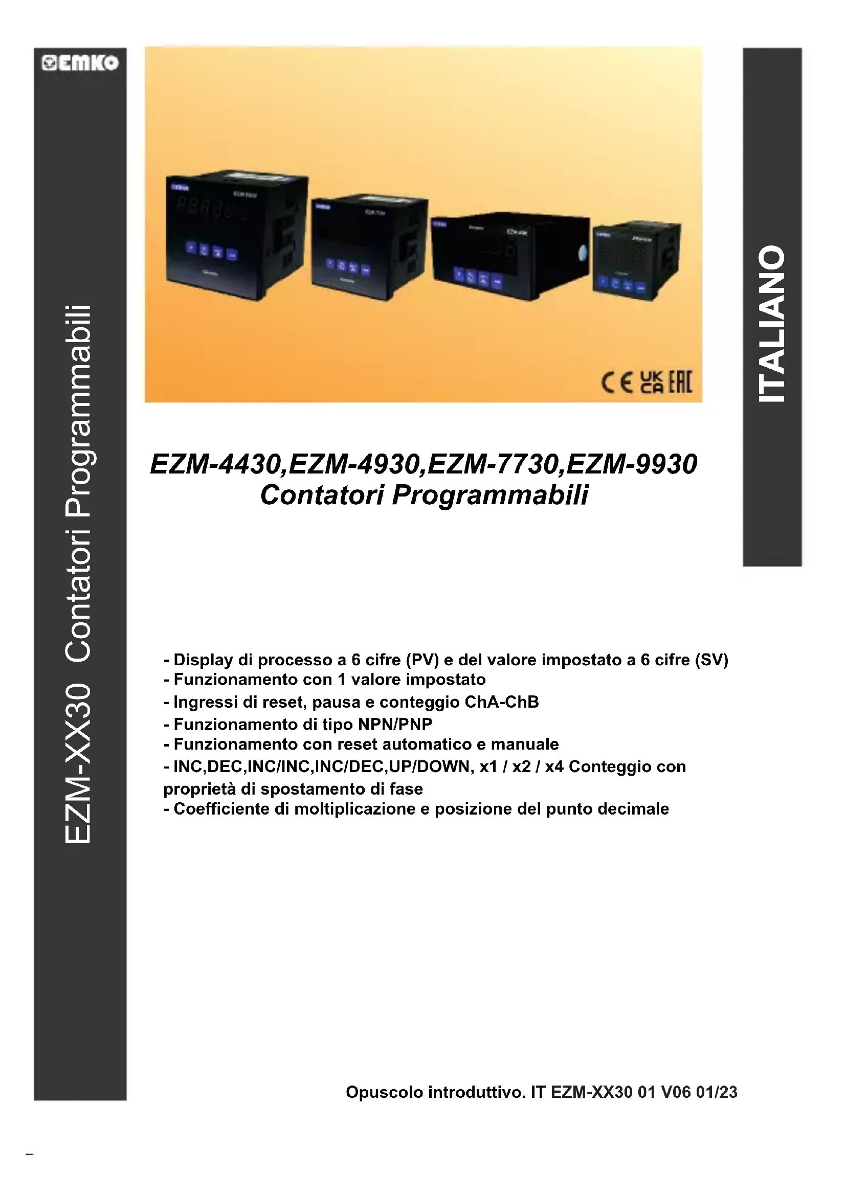 Contatori Programmabili ITALIANO Opuscolo introduttivo. IT EZM-XX30 01 V06 01/23 - Display di processo a 6 cifre (PV) e del valore impostato a 6 cifre (SV) - Funzionamento con 1 valore impostato - Ingressi di reset, pausa e conteggio ChA-ChB - Funzionamento di tipo NPN/PNP - Funzionamento con reset automatico e manuale - INC,DEC,INC/INC,INC/DEC,UP/DOWN, x1 / x2 / x4 Conteggio con proprietà di spostamento di fase - Coefficiente di moltiplicazione e posizione del punto decimale2 SPECIFICHE: INGRESSI: Uscita di processo: Uscita a relè (5A@250VV a carico resistivo) Ingressi di conteggio (Ch-A,Ch-B): Si possono collegare interruttori, sensori capacitivi o encoder. Ingresso di reset: Si possono collegare interruttore, sensore di prossimità, capacitivo o encoder. Ingressi di pausa: Si possono collegare interruttori, sensori capacitivi o encoder. Selezione del tipo di sensore: Si può selezionare NPN o PNP. Funzione di reset: Automatico o manuale. Tipi di ingresso conteggio e frequenza massima: INC,DEC,INC/INC,INC/DEC,UP/DOWN max.20 kHZ. x1 / x2 / x4: Spostamento di fase (per encoder) Conteggio;Max.10 kHZ. Reset e filtro di ingresso pausa: 2-50 msec (regolabile nel parametro.) USCITA DISPLAY: Display valore di processo: EZM-4430 : Display a LED a 6 cifre da 8 mm rosso EZM-4930 : Display a LED a 6 cifre da 13.2 mm rosso EZM-7730 : Display a LED a 6 cifre da 10.8 mm rosso EZM-9930 : Display a LED a 6 cifre da 13.2 mm rosso Display valore impostato: EZM-4430 : Display a LED a 6 cifre da 8 mm verde EZM-4930 : Display a LED a 6 cifre da 8 mm verde EZM-7730 : Display a LED a 6 cifre da 8 mm verde EZM-9930 : Display a LED a 6 cifre da 8 mm verde Display a LED : LED SV(valore impostato), OP(posizione di uscita).