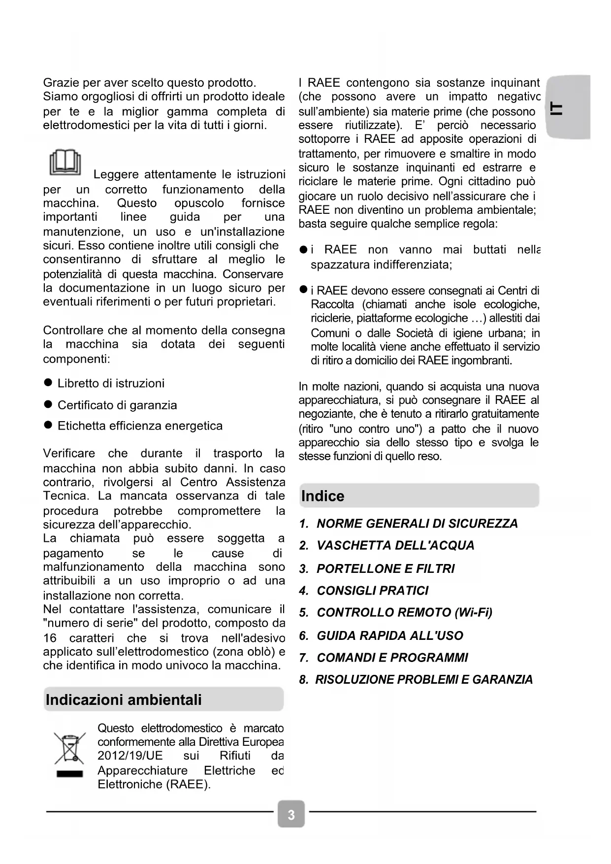 Garanzia Il prodotto è garantito, oltre che ai sensi di legge, alle condizioni e nei termini riportati sul certificato di garanzia convenzionale inserito nel prodotto. Il certificato dovrà essere conservato e mostrato al nostro Centro di Assistenza Tecnica Autorizzato, in caso di necessità, insieme allo scontrino comprovante l’acquisto dell’elettrodomestico