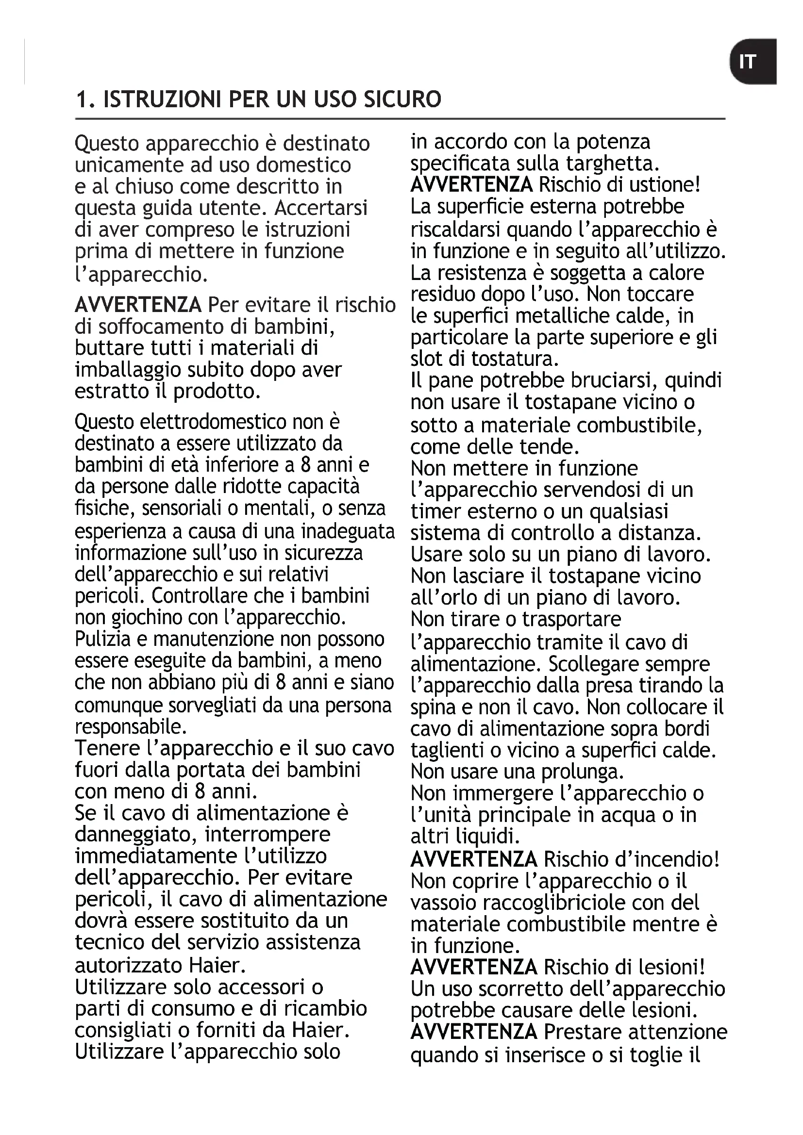 - Lösung: Drücken Sie auf eine beliebige Taste oder drücken Sie den Hebel nach unten. DEIT Questo apparecchio è destinato unicamente ad uso domestico e al chiuso come descritto in questa guida utente. Accertarsi di aver compreso le istruzioni prima di mettere in funzione l’apparecchio. AVVERTENZA Per evitare il rischio di soocamento di bambini, buttare tutti i materiali di imballaggio subito dopo aver estratto il prodotto. Questo elettrodomestico non è destinato a essere utilizzato da bambini di età inferiore a 8 anni e da persone dalle ridotte capacità siche, sensoriali o mentali, o senza esperienza a causa di una inadeguata informazione sull’uso in sicurezza dell’apparecchio e sui relativi pericoli. Controllare che i bambini non giochino con l’apparecchio. Pulizia e manutenzione non possono essere eseguite da bambini, a meno che non abbiano più di 8 anni e siano comunque sorvegliati da una persona responsabile. Tenere l’apparecchio e il suo cavo fuori dalla portata dei bambini con meno di 8 anni. Se il cavo di alimentazione è danneggiato, interrompere immediatamente l’utilizzo dell’apparecchio. Per evitare pericoli, il cavo di alimentazione dovrà essere sostituito da un tecnico del servizio assistenza autorizzato Haier. Utilizzare solo accessori o parti di consumo e di ricambio consigliati o forniti da Haier. Utilizzare l’apparecchio solo in accordo con la potenza specicata sulla targhetta. AVVERTENZA Rischio di ustione! La supercie esterna potrebbe riscaldarsi quando l’apparecchio è in funzione e in seguito all’utilizzo. La resistenza è soggetta a calore residuo dopo l’uso. Non toccare le superci metalliche calde, in particolare la parte superiore e gli slot di tostatura. Il pane potrebbe bruciarsi, quindi non usare il tostapane vicino o sotto a materiale combustibile, come delle tende. Non mettere in funzione l’apparecchio servendosi di un timer esterno o un qualsiasi sistema di controllo a distanza. Usare solo su un piano di lavoro. Non lasciare il tostapane vicino all’orlo di un piano di lavoro. Non tirare o trasportare l’apparecchio tramite il cavo di alimentazione. Scollegare sempre l’apparecchio dalla presa tirando la spina e non il cavo. Non collocare il cavo di alimentazione sopra bordi taglienti o vicino a superci calde. Non usare una prolunga. Non immergere l’apparecchio o l’unità principale in acqua o in altri liquidi. AVVERTENZA Rischio d’incendio! Non coprire l’apparecchio o il vassoio raccoglibriciole con del materiale combustibile mentre è in funzione. AVVERTENZA Rischio di lesioni! Un uso scorretto dell’apparecchio potrebbe causare delle lesioni. AVVERTENZA Prestare attenzione quando si inserisce o si toglie il