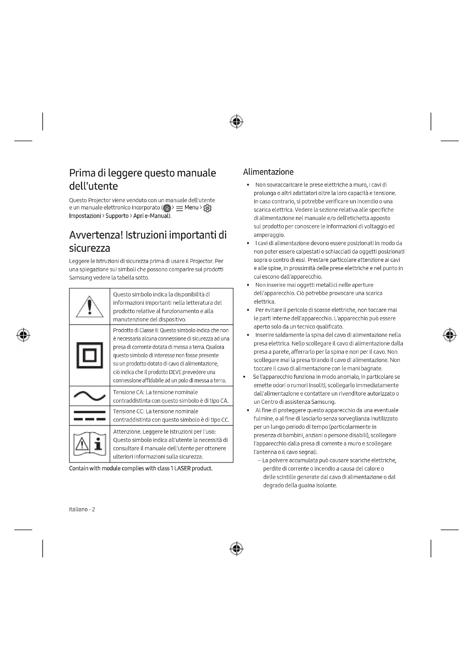 - Il se peut que ces licences ne soient pas prises en charge selon le modèle ou la zone géographique. The terms HDMI and HDMI High-Definition Multimedia Interface, and the HDMI Logo are trademarks or registered trademarks of HDMI Licensing Administrator, Inc. in the United States and other countries.Cette page est laissée intentionnellement vierge.Italiano - 2 Prima di leggere questo manuale dell'utente Questo Projector viene venduto con un manuale dell'utente e un manuale elettronico incorporato ( > Menu > Impostazioni > Supporto > Apri e-Manual). Avvertenza! Istruzioni importanti di sicurezza Leggere le Istruzioni di sicurezza prima di usare il Projector. Per una spiegazione sui simboli che possono comparire sui prodotti Samsung vedere la tabella sotto. Questo simbolo indica la disponibilità di informazioni importanti nella letteratura del prodotto relative al funzionamento e alla manutenzione del dispositivo. Prodotto di Classe II: Questo simbolo indica che non è necessaria alcuna connessione di sicurezza ad una presa di corrente dotata di messa a terra. Qualora questo simbolo di interesse non fosse presente su un prodotto dotato di cavo di alimentazione, ciò indica che il prodotto DEVE prevedere una connessione affidabile ad un polo di messa a terra. Tensione CA: La tensione nominale contraddistinta con questo simbolo è di tipo CA. Tensione CC: La tensione nominale contraddistinta con questo simbolo è di tipo CC. Attenzione. Leggere le Istruzioni per l'uso: Questo simbolo indica all'utente la necessità di consultare il manuale dell'utente per ottenere ulteriori informazioni sulla sicurezza. Contain with module complies with class 1 LASER product. Alimentazione