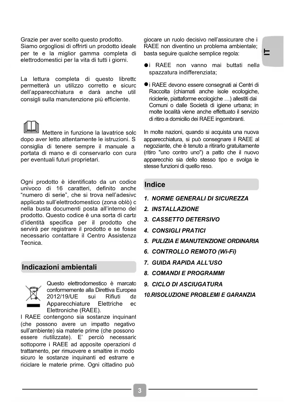 Mettere in funzione la lavatrice solo dopo aver letto attentamente le istruzioni. Si consiglia di tenere sempre il manuale a portata di mano e di conservarlo con cura per eventuali futuri proprietari.