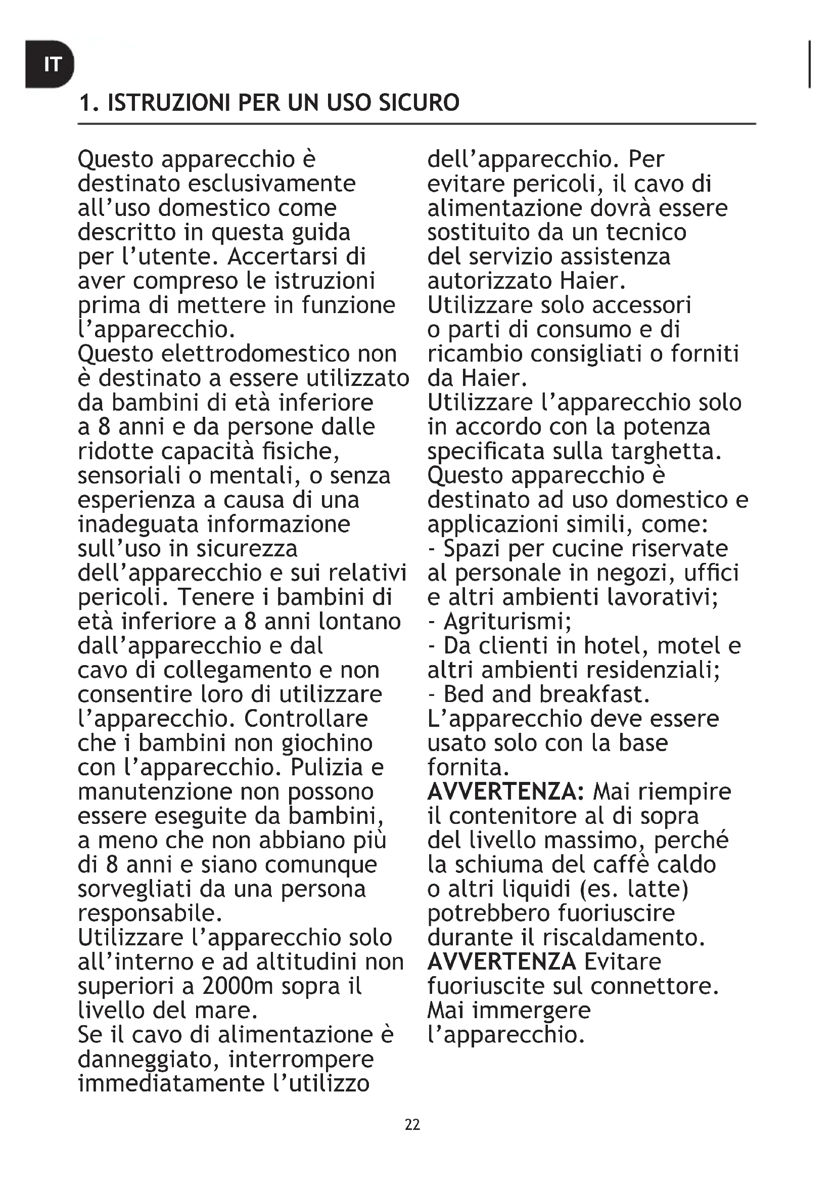 - der inhalt kann je nach modell variieren. DE22 Questo apparecchio è destinato esclusivamente all’uso domestico come descritto in questa guida per l’utente. Accertarsi di aver compreso le istruzioni prima di mettere in funzione l’apparecchio. Questo elettrodomestico non è destinato a essere utilizzato da bambini di età inferiore a 8 anni e da persone dalle ridotte capacità siche, sensoriali o mentali, o senza esperienza a causa di una inadeguata informazione sull’uso in sicurezza dell’apparecchio e sui relativi pericoli. Tenere i bambini di età inferiore a 8 anni lontano dall’apparecchio e dal cavo di collegamento e non consentire loro di utilizzare l’apparecchio. Controllare che i bambini non giochino con l’apparecchio. Pulizia e manutenzione non possono essere eseguite da bambini, a meno che non abbiano più di 8 anni e siano comunque sorvegliati da una persona responsabile. Utilizzare l’apparecchio solo all’interno e ad altitudini non superiori a 2000m sopra il livello del mare. Se il cavo di alimentazione è danneggiato, interrompere immediatamente l’utilizzo dell’apparecchio. Per evitare pericoli, il cavo di alimentazione dovrà essere sostituito da un tecnico del servizio assistenza autorizzato Haier. Utilizzare solo accessori o parti di consumo e di ricambio consigliati o forniti da Haier. Utilizzare l’apparecchio solo in accordo con la potenza specicata sulla targhetta. Questo apparecchio è destinato ad uso domestico e applicazioni simili, come: - Spazi per cucine riservate al personale in negozi, ufci e altri ambienti lavorativi; - Agriturismi; - Da clienti in hotel, motel e altri ambienti residenziali; - Bed and breakfast. L’apparecchio deve essere usato solo con la base fornita. AVVERTENZA: Mai riempire il contenitore al di sopra del livello massimo, perché la schiuma del caffè caldo o altri liquidi (es. latte) potrebbero fuoriuscire durante il riscaldamento. AVVERTENZA Evitare fuoriuscite sul connettore. Mai immergere l’apparecchio.