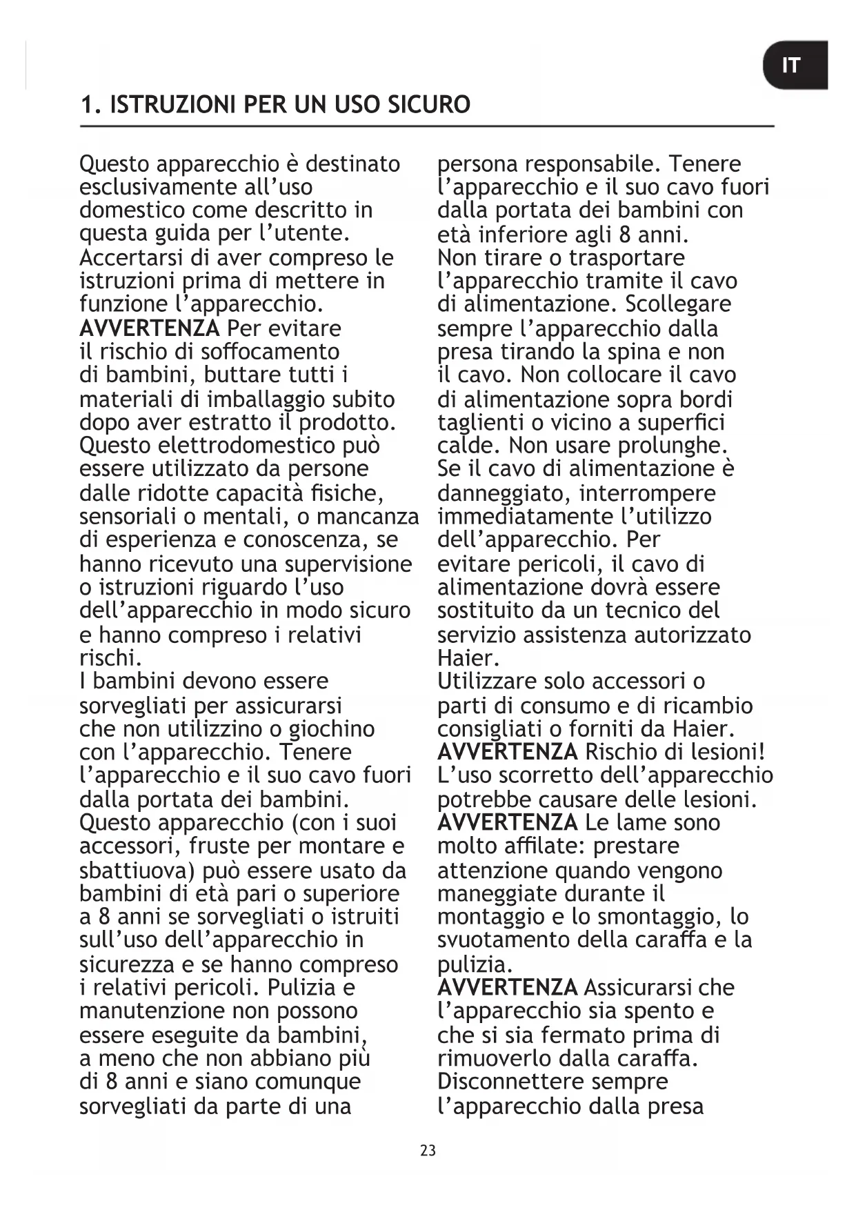 Betriebs heiß. Lassen Sie das Gerät vollständig abkühlen, bevor Sie es wieder benutzen.23 Questo apparecchio è destinato esclusivamente all’uso domestico come descritto in questa guida per l’utente. Accertarsi di aver compreso le istruzioni prima di mettere in funzione l’apparecchio. AVVERTENZA Per evitare il rischio di soocamento di bambini, buttare tutti i materiali di imballaggio subito dopo aver estratto il prodotto. Questo elettrodomestico può essere utilizzato da persone dalle ridotte capacità siche, sensoriali o mentali, o mancanza di esperienza e conoscenza, se hanno ricevuto una supervisione o istruzioni riguardo l’uso dell’apparecchio in modo sicuro e hanno compreso i relativi rischi. I bambini devono essere sorvegliati per assicurarsi che non utilizzino o giochino con l’apparecchio. Tenere l’apparecchio e il suo cavo fuori dalla portata dei bambini. Questo apparecchio (con i suoi accessori, fruste per montare e sbattiuova) può essere usato da bambini di età pari o superiore a 8 anni se sorvegliati o istruiti sull’uso dell’apparecchio in sicurezza e se hanno compreso i relativi pericoli. Pulizia e manutenzione non possono essere eseguite da bambini, a meno che non abbiano più di 8 anni e siano comunque sorvegliati da parte di una persona responsabile. Tenere l’apparecchio e il suo cavo fuori dalla portata dei bambini con età inferiore agli 8 anni. Non tirare o trasportare l’apparecchio tramite il cavo di alimentazione. Scollegare sempre l’apparecchio dalla presa tirando la spina e non il cavo. Non collocare il cavo di alimentazione sopra bordi taglienti o vicino a superci calde. Non usare prolunghe. Se il cavo di alimentazione è danneggiato, interrompere immediatamente l’utilizzo dell’apparecchio. Per evitare pericoli, il cavo di alimentazione dovrà essere sostituito da un tecnico del servizio assistenza autorizzato Haier. Utilizzare solo accessori o parti di consumo e di ricambio consigliati o forniti da Haier. AVVERTENZA Rischio di lesioni! L’uso scorretto dell’apparecchio potrebbe causare delle lesioni. AVVERTENZA Le lame sono molto alate: prestare attenzione quando vengono maneggiate durante il montaggio e lo smontaggio, lo svuotamento della caraa e la pulizia. AVVERTENZA Assicurarsi che l’apparecchio sia spento e che si sia fermato prima di rimuoverlo dalla caraa. Disconnettere sempre l’apparecchio dalla presa