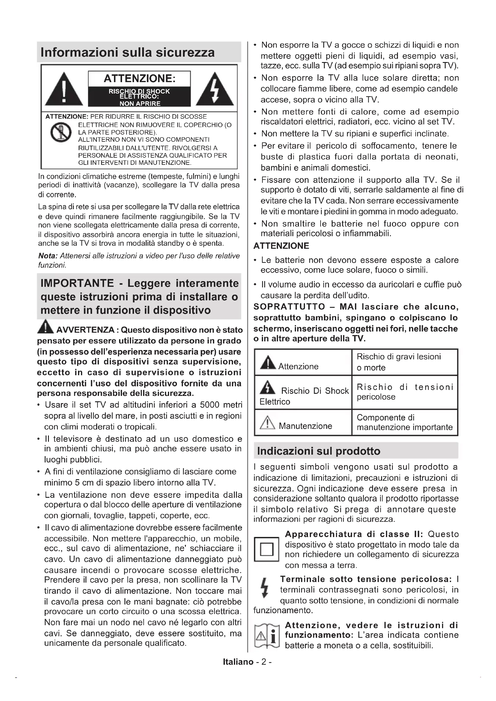 causare la perdita dell’udito. SOPRATTUTTO – MAI lasciare che alcuno, soprattutto bambini, spingano o colpiscano lo schermo, inseriscano oggetti nei fori, nelle tacche o in altre aperture della TV. AttenzioneRischio di gravi lesioni o morte Rischio Di Shock ElettricoRischio di tensioni pericolose ManutenzioneComponente di manutenzione importante Indicazioni sul prodotto I seguenti simboli vengono usati sul prodotto a indicazione di limitazioni, precauzioni e istruzioni di