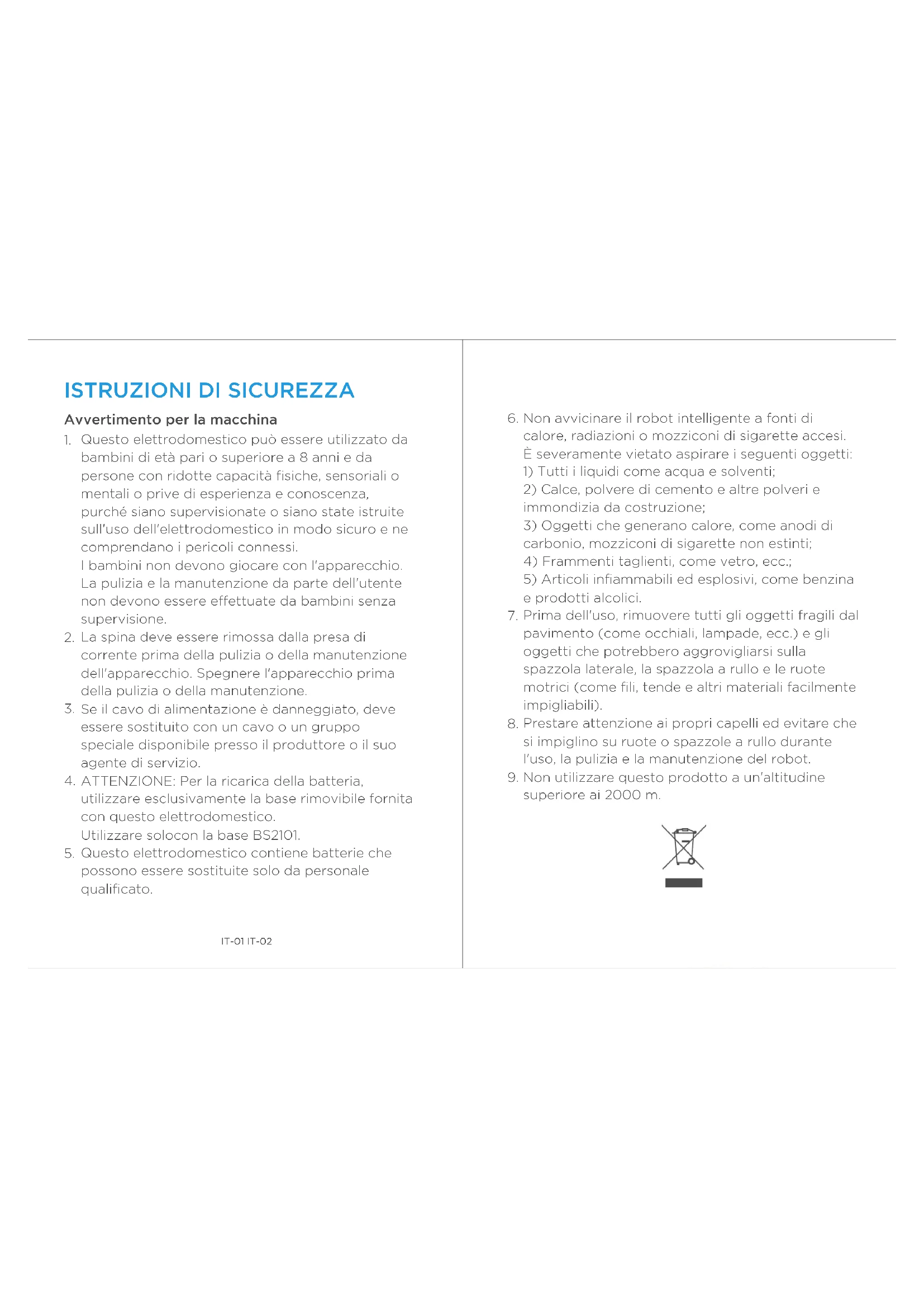 APP Descrizione delle dei guasti Possibili cause Soluzioni L'unità principale nonviene in contatto coni chip di ricarica. La stazione di raccolta della polvere è posizionata in modo improprio. Posizionare l'unità principale 1 m davanti alla stazione di raccolta della polvere e premere il pulsante di ritorno in carica. Vedere pagina 12 nel manuale.1.IT-29 IT-30 L'unità principale non completa la pulizia ma ritorna in carica. Pulizia non come programmato. Le pulizie programmate sono state cancellate. L'unità principale è in modalità DND (Do Not Disturb).