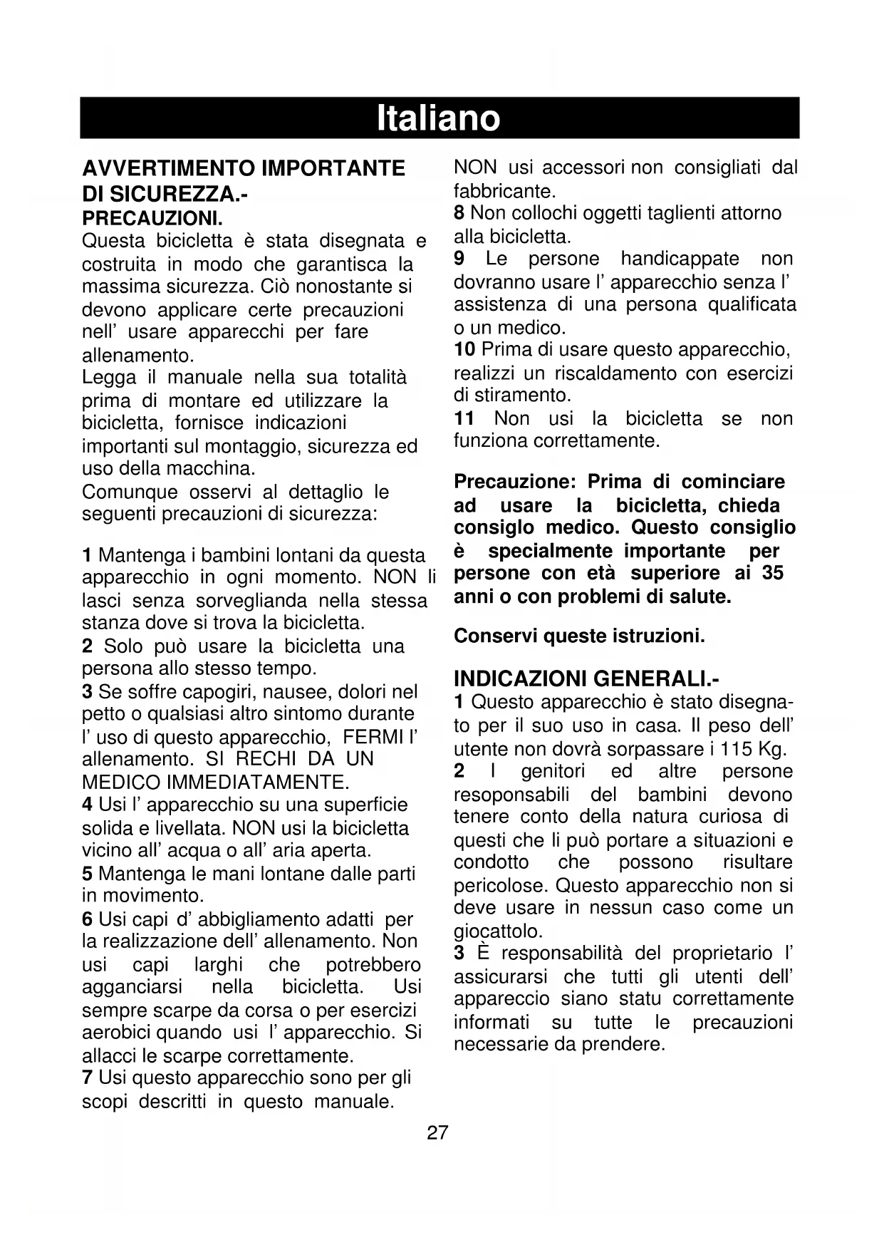Italiano AVVERTIMENTO IMPORTANTE DI SICUREZZA.- PRECAUZIONI. Questa bicicletta è stata disegnata e costruita in modo che garantisca la massima sicurezza. Ciò nonostante si devono applicare certe precauzioni nell’ usare apparecchi per fare allenamento. Legga il manuale nella sua totalità prima di montare ed utilizzare la bicicletta, fornisce indicazioni importanti sul montaggio, sicurezza ed uso della macchina. Comunque osservi al dettaglio le seguenti precauzioni di sicurezza: 1 Mantenga i bambini lontani da questa apparecchio in ogni momento. NON li lasci senza sorveglianda nella stessa stanza dove si trova la bicicletta. 2 Solo può usare la bicicletta una persona allo stesso tempo. 3 Se soffre capogiri, nausee, dolori nel petto o qualsiasi altro sintomo durante l’ uso di questo apparecchio, FERMI l’ allenamento. SI RECHI DA UN MEDICO IMMEDIATAMENTE. 4 Usi l’ apparecchio su una superficie solida e livellata. NON usi la bicicletta vicino all’ acqua o all’ aria aperta. 5 Mantenga le mani lontane dalle parti in movimento. 6 Usi capi d’ abbigliamento adatti per la realizzazione dell’ allenamento. Non usi capi larghi che potrebbero agganciarsi nella bicicletta. Usi sempre scarpe da corsa o per esercizi aerobici quando usi l’ apparecchio. Si allacci le scarpe correttamente. 7 Usi questo apparecchio sono per gli scopi descritti in questo manuale. NON usi accessori non consigliati dal fabbricante. 8 Non collochi oggetti taglienti attorno alla bicicletta. 9 Le persone handicappate non dovranno usare l’ apparecchio senza l’ assistenza di una persona qualificata o un medico. 10 Prima di usare questo apparecchio, realizzi un riscaldamento con esercizi di stiramento. 11 Non usi la bicicletta se non funziona correttamente. Precauzione: Prima di cominciare ad usare la bicicletta, chieda consiglo medico. Questo consiglio è specialmente importante per persone con età superiore ai 35 anni o con problemi di salute. Conservi queste istruzioni. INDICAZIONI GENERALI.- 1 Questo apparecchio è stato disegna- to per il suo uso in casa. Il peso dell’ utente non dovrà sorpassare i 115 Kg. 2 I genitori ed altre persone resoponsabili del bambini devono tenere conto della natura curiosa di questi che li può portare a situazioni e condotto che possono risultare pericolose. Questo apparecchio non si deve usare in nessun caso come un giocattolo. 3 È responsabilità del proprietario l’ assicurarsi che tutti gli utenti dell’ appareccio siano statu correttamente informati su tutte le precauzioni necessarie da prendere.28