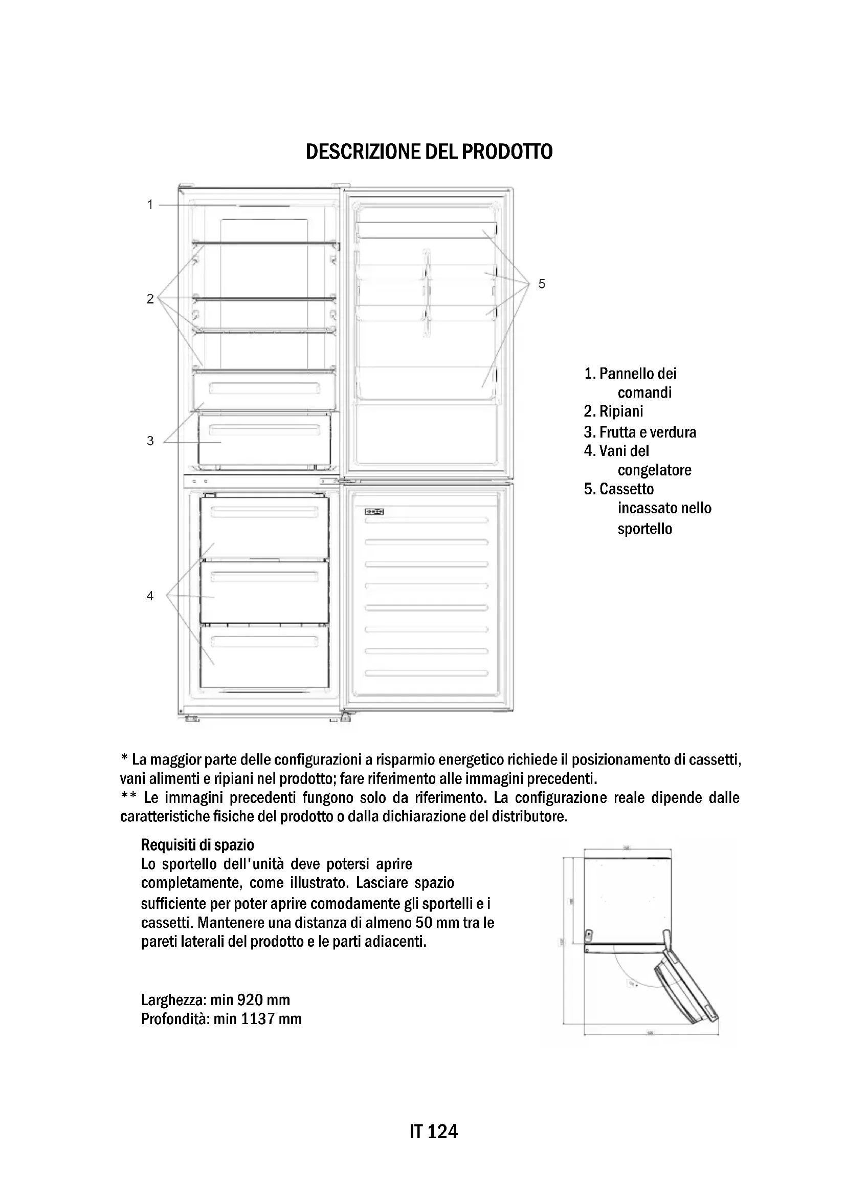Requisiti di spazio Lo sportello dell'unità deve potersi aprire completamente, come illustrato. Lasciare spazio sufficiente per poter aprire comodamente gli sportelli e i cassetti. Mantenere una distanza di almeno 50 mm tra le pareti laterali del prodotto e le parti adiacenti. Larghezza: min 920 mm Profondità: min 1137 mmIT 125 A. Tasto di accensione/spegnimento: per accendere e spegnere l'elettrodomestico B. Tasto WiFi: per attivare o disattivare la funzione WiFi C. Tasto Mode: per selezionare la funzione desiderata D. Tasto della temperatura: per selezionare la temperatura del frigorifero e del congelatore a. Icona dell'area frigorifero/congelatore: indica quale vano dell'elettrodomestico è selezionato b. Icona Super Freeze: indica se è attivata la funzione Super Freeze c. Livelli di temperatura del congelatore: indicano la temperatura selezionata nel congelatore d. Icona Super Cool: indica se è attivata la funzione Super Cool e. Livelli di temperatura del frigorifero: indicano la temperatura selezionata nel frigorifero f. Icona della temperatura personalizzata: indica se la temperatura è stata selezionata dall'app g. Icona della modalità Eco; indica se è attivata la modalità Eco h. Icona della funzione Holiday: indica se è attivata la funzione Holiday