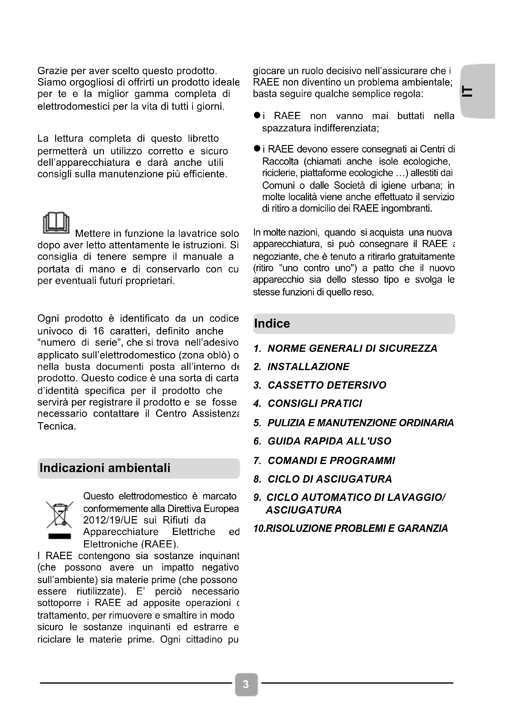 Grazie per aver scelto questo prodotto. Siamo orgogliosi di offrirti un prodotto ideale per te e la miglior gamma completa di elettrodomestici per la vita di tutti i giorni. La lettura completa di questo libretto permetterà un utilizzo corretto e sicuro dell’apparecchiatura e darà anche utili consigli sulla manutenzione più efficiente. Mettere in funzione la lavatrice solo dopo aver letto attentamente le istruzioni. Si consiglia di tenere sempre il manuale a portata di mano e di conservarlo con cura per eventuali futuri proprietari. Ogni prodotto è identificato da un codice univoco di 16 caratteri, definito anche “numero di serie”, che si trova nell’adesivo applicato sull’elettrodomestico (zona oblò) o nella busta documenti posta all’interno del prodotto. Questo codice è una sorta di carta d’identità specifica per il prodotto che servirà per registrare il prodotto e se fosse necessario contattare il Centro Assistenza Tecnica.
