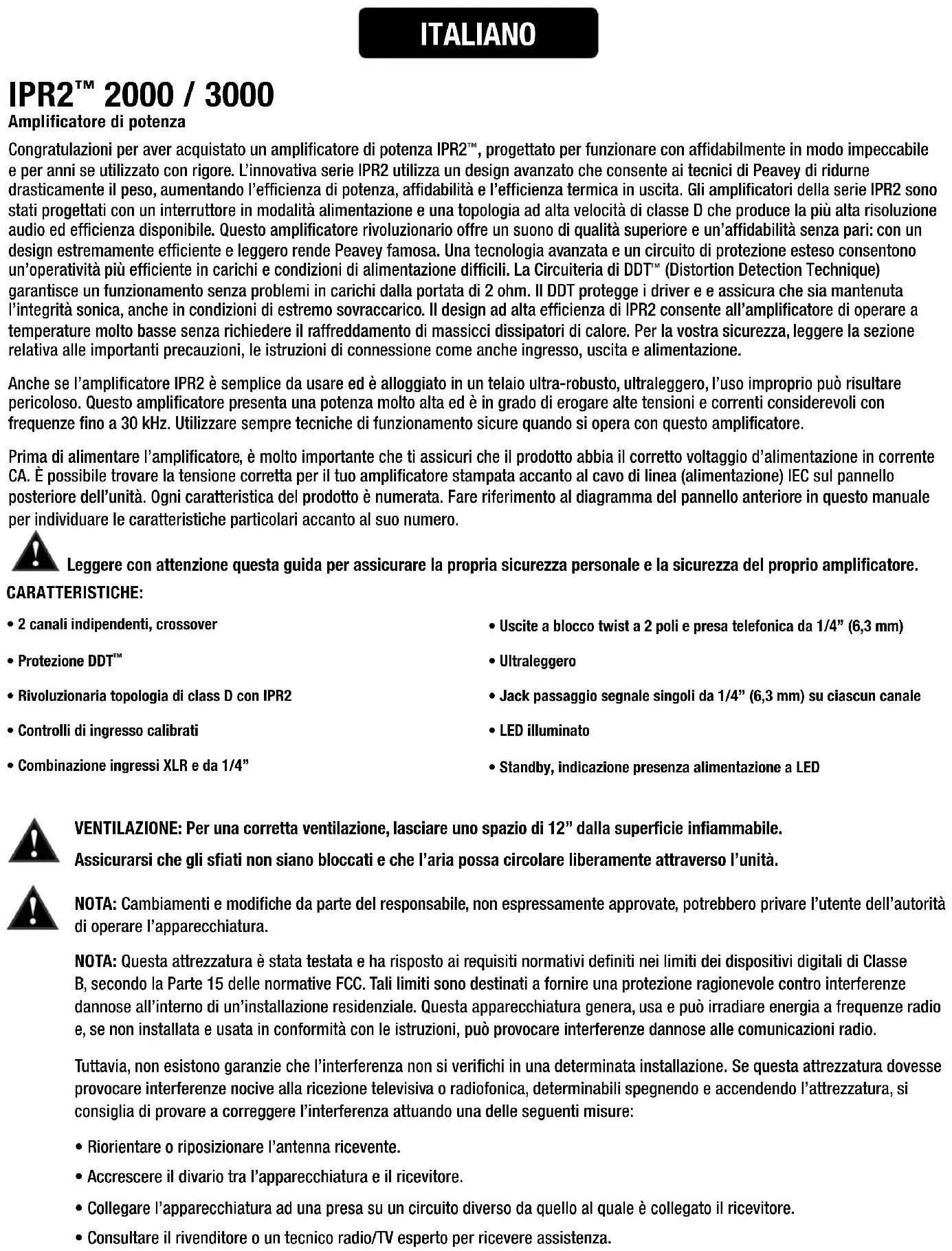 (Distortion Detection Technique) garantisce un funzionamento senza problemi in carichi dalla portata di 2 ohm. Il DDT protegge i driver e e assicura che sia mantenuta l’integrità sonica, anche in condizioni di estremo sovraccarico. Il design ad alta efficienza di IPR2 consente all’amplificatore di operare a temperature molto basse senza richiedere il raffreddamento di massicci dissipatori di calore. Per la vostra sicurezza, leggere la sezione relativa alle importanti precauzioni, le istruzioni di connessione come anche ingresso, uscita e alimentazione. Anche se l’amplificatore IPR2 è semplice da usare ed è alloggiato in un telaio ultra-robusto, ultraleggero, l’uso improprio può risultare pericoloso. Questo amplificatore presenta una potenza molto alta ed è in grado di erogare alte tensioni e correnti considerevoli con frequenze fino a 30 kHz. Utilizzare sempre tecniche di funzionamento sicure quando si opera con questo amplificatore. Prima di alimentare l’amplificatore, è molto importante che ti assicuri che il prodotto abbia il corretto voltaggio d’alimentazione in corrente CA. È possibile trovare la tensione corretta per il tuo amplificatore stampata accanto al cavo di linea (alimentazione) IEC sul pannello posteriore dell’unità. Ogni caratteristica del prodotto è numerata. Fare riferimento al diagramma del pannello anteriore in questo manuale per individuare le caratteristiche particolari accanto al suo numero. Leggere con attenzione questa guida per assicurare la propria sicurezza personale e la sicurezza del proprio amplificatore. ITALIANO VENTILAZIONE: Per una corretta ventilazione, lasciare uno spazio di 12” dalla superficie infiammabile. Assicurarsi che gli sfiati non siano bloccati e che l’aria possa circolare liberamente attraverso l’unità. CARATTERISTICHE: