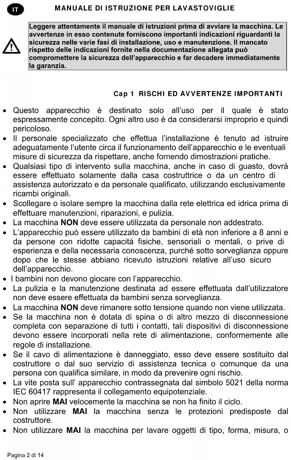 Questo apparecchio è destinato solo all’uso per il quale è stato espressamente concepito. Ogni altro uso è da considerarsi improprio e quindi pericoloso. Il personale specializzato che effettua l’installazione è tenuto ad istruire adeguatamente l’utente circa il funzionamento dell’apparecchio e le eventuali misure di sicurezza da rispettare, anche fornendo dimostrazioni pratiche. Qualsiasi tipo di intervento sulla macchina, anche in caso di guasto, dovrà essere effettuato solamente dalla casa costruttrice o da un centro di assistenza autorizzato e da personale qualificato, utilizzando esclusivamente ricambi originali. Scollegare o isolare sempre la macchina dalla rete elettrica ed idrica prima di effettuare manutenzioni, riparazioni, e pulizia. La macchina NON deve essere utilizzata da personale non addestrato. L’apparecchio può essere utilizzato da bambini di età non inferiore a 8 anni e da persone con ridotte capacità fisiche, sensoriali o mentali, o prive di esperienza e della necessaria conoscenza, purché sotto sorveglianza oppure dopo che le stesse abbiano ricevuto istruzioni relative all’uso sicuro dell’apparecchio. I bambini non devono giocare con l’apparecchio. La pulizia e la manutenzione destinata ad essere effettuata dall’utilizzatore non deve essere effettuata da bambini senza sorveglianza. La macchina NON deve rimanere sotto tensione quando non viene utilizzata. Se la macchina non è dotata di spina o di altro mezzo di disconnessione completa con separazione di tutti i contatti, tali dispositivi di disconnessione devono essere incorporati nella rete di alimentazione, conformemente alle regole di installazione. Se il cavo di alimentazione è danneggiato, esso deve essere sostituito dal costruttore o dal suo servizio di assistenza tecnica o comunque da una persona con qualifica similare, in modo da prevenire ogni rischio. La vite posta sull’ apparecchio contrassegnata dal simbolo 5021 della norma IEC 60417 rappresenta il collegamento equipotenziale. Non aprire MAI velocemente la macchina se non ha finito il ciclo. Non utilizzare MAI la macchina senza le protezioni predisposte dal costruttore. Non utilizzare MAI la macchina per lavare oggetti di tipo, forma, misura, oMANUALE DI ISTRUZIONE PER LAVASTOVIGLIE Pagina 3 di 14