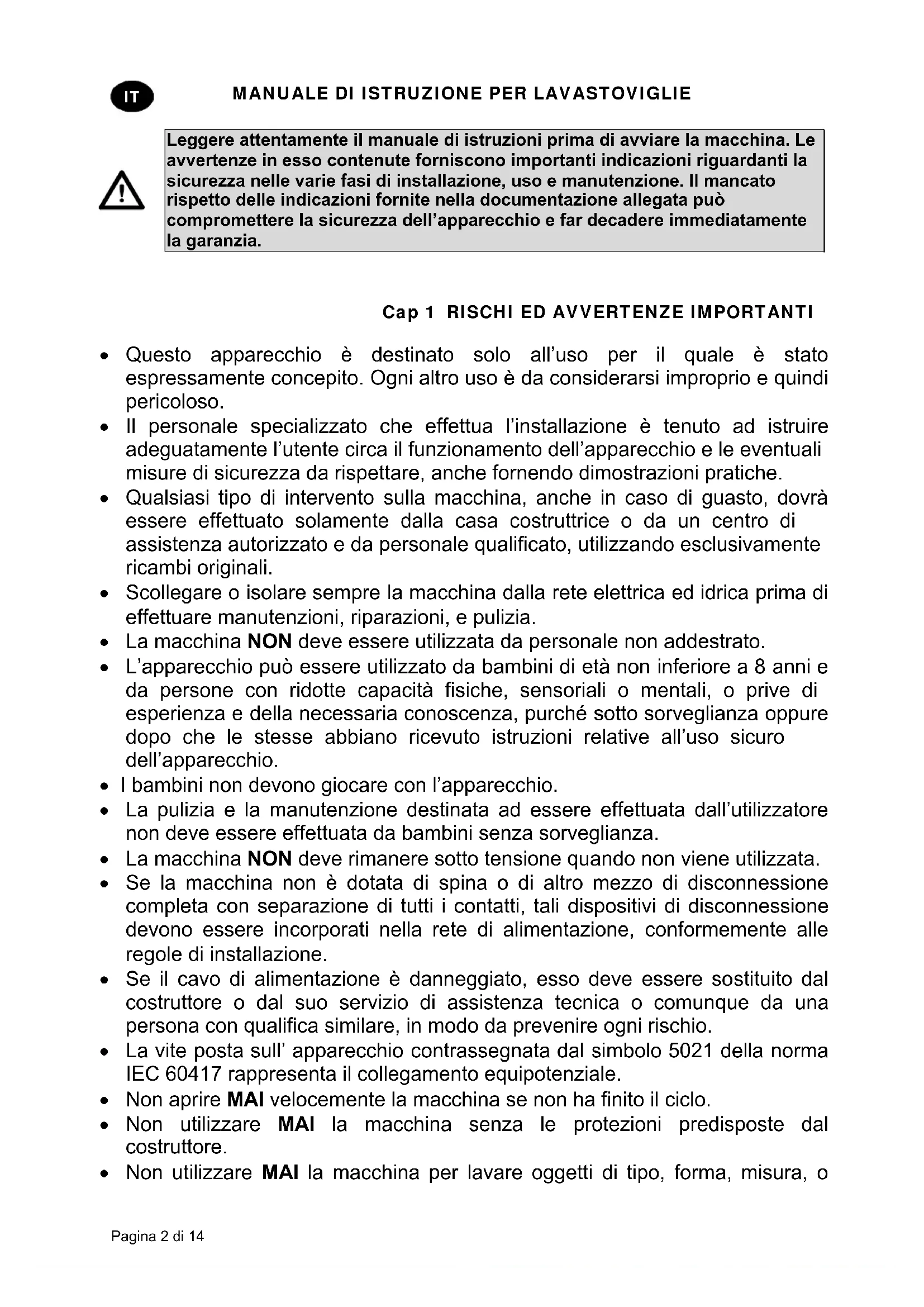 Questo apparecchio è destinato solo all’uso per il quale è stato espressamente concepito. Ogni altro uso è da considerarsi improprio e quindi pericoloso. Il personale specializzato che effettua l’installazione è tenuto ad istruire adeguatamente l’utente circa il funzionamento dell’apparecchio e le eventuali misure di sicurezza da rispettare, anche fornendo dimostrazioni pratiche. Qualsiasi tipo di intervento sulla macchina, anche in caso di guasto, dovrà essere effettuato solamente dalla casa costruttrice o da un centro di assistenza autorizzato e da personale qualificato, utilizzando esclusivamente ricambi originali. Scollegare o isolare sempre la macchina dalla rete elettrica ed idrica prima di effettuare manutenzioni, riparazioni, e pulizia. La macchina NON deve essere utilizzata da personale non addestrato. L’apparecchio può essere utilizzato da bambini di età non inferiore a 8 anni e da persone con ridotte capacità fisiche, sensoriali o mentali, o prive di esperienza e della necessaria conoscenza, purché sotto sorveglianza oppure dopo che le stesse abbiano ricevuto istruzioni relative all’uso sicuro dell’apparecchio. I bambini non devono giocare con l’apparecchio. La pulizia e la manutenzione destinata ad essere effettuata dall’utilizzatore non deve essere effettuata da bambini senza sorveglianza. La macchina NON deve rimanere sotto tensione quando non viene utilizzata. Se la macchina non è dotata di spina o di altro mezzo di disconnessione completa con separazione di tutti i contatti, tali dispositivi di disconnessione devono essere incorporati nella rete di alimentazione, conformemente alle regole di installazione. Se il cavo di alimentazione è danneggiato, esso deve essere sostituito dal costruttore o dal suo servizio di assistenza tecnica o comunque da una persona con qualifica similare, in modo da prevenire ogni rischio. La vite posta sull’ apparecchio contrassegnata dal simbolo 5021 della norma IEC 60417 rappresenta il collegamento equipotenziale. Non aprire MAI velocemente la macchina se non ha finito il ciclo. Non utilizzare MAI la macchina senza le protezioni predisposte dal costruttore. Non utilizzare MAI la macchina per lavare oggetti di tipo, forma, misura, oMANUALE DI ISTRUZIONE PER LAVASTOVIGLIE Pagina 3 di 14