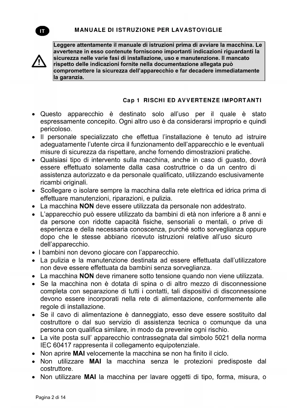 Leggere attentamente il manuale di istruzioni prima di avviare la macchina. Le avvertenze in esso contenute forniscono importanti indicazioni riguardanti la sicurezza nelle varie fasi di installazione, uso e manutenzione. Il mancato rispetto delle indicazioni fornite nella documentazione allegata può compromettere la sicurezza dell’apparecchio e far decadere immediatamente la garanzia. Cap 1 RISCHI ED AVVERTENZE IMPORTANTI