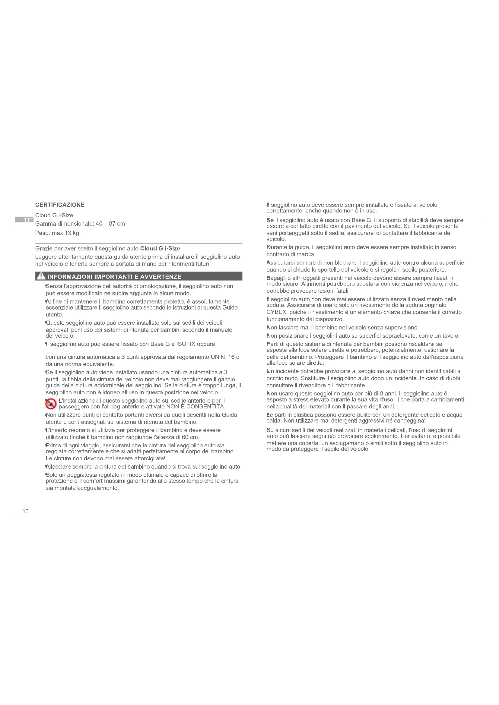 Scarica le istruzioni per il tuo Seggiolino auto in formato PDF gratuitamente! Trova il tuo manuale Cloud G i-Size - CYBEX e riprendi in mano il tuo dispositivo elettronico. In questa pagina sono pubblicati tutti i documenti necessari per l'utilizzo del tuo dispositivo. Cloud G i-Size del marchio CYBEX.