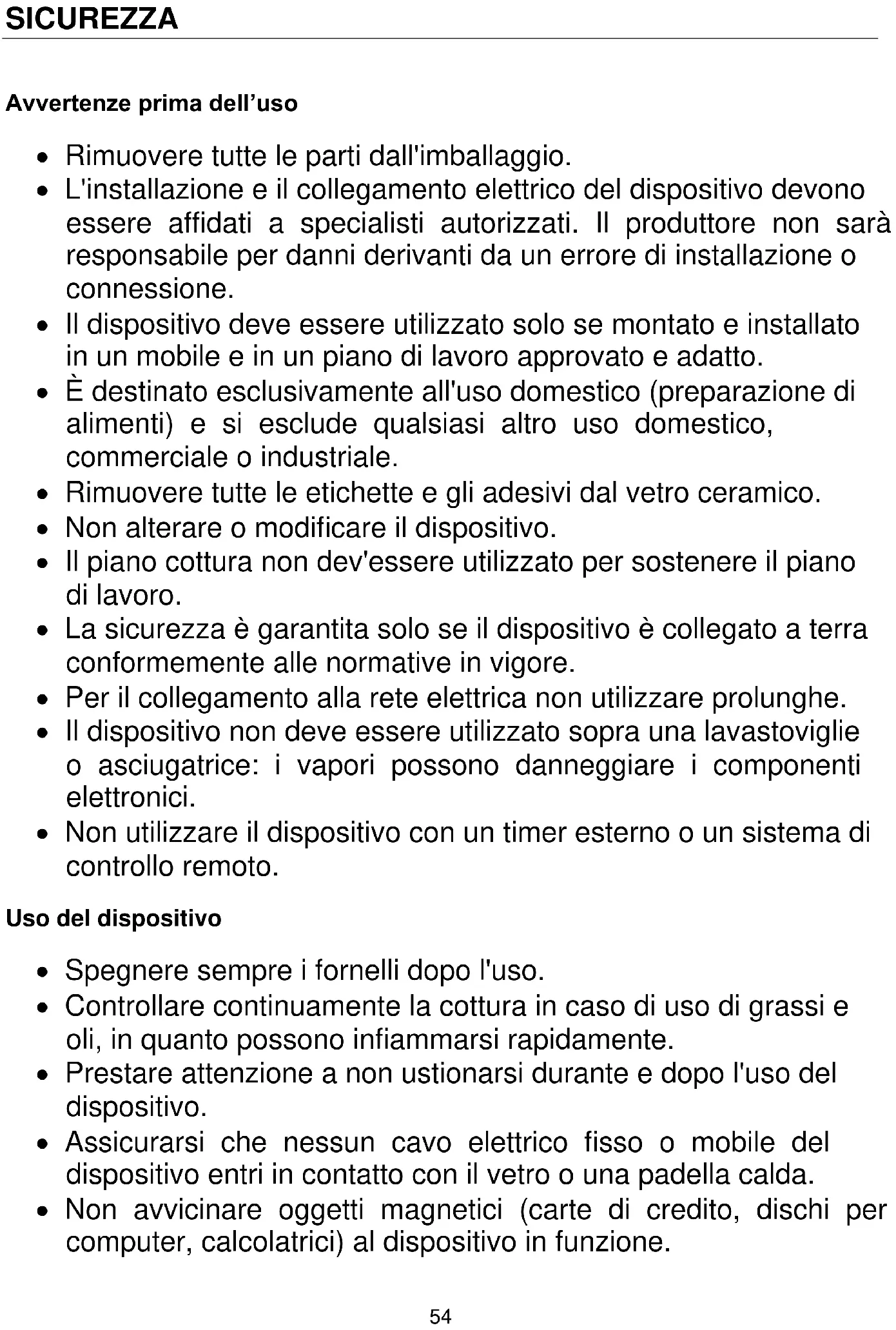 PROTEZIONE DELL'AMBIENTE ................................................................................................ 66 ISTRUZIONI DI INSTALLAZIONE .............................................................................................. 67 COLLEGAMENTO ELETTRICO ................................................................................................. 6854 SICUREZZA Avvertenze prima dell’uso Rimuovere tutte le parti dall'imballaggio. L'installazione e il collegamento elettrico del dispositivo devono essere affidati a specialisti autorizzati. Il produttore non sarà responsabile per danni derivanti da un errore di installazione o connessione. Il dispositivo deve essere utilizzato solo se montato e installato in un mobile e in un piano di lavoro approvato e adatto. È destinato esclusivamente all'uso domestico (preparazione di alimenti) e si esclude qualsiasi altro uso domestico, commerciale o industriale. Rimuovere tutte le etichette e gli adesivi dal vetro ceramico. Non alterare o modificare il dispositivo. Il piano cottura non dev'essere utilizzato per sostenere il piano di lavoro. La sicurezza è garantita solo se il dispositivo è collegato a terra conformemente alle normative in vigore. Per il collegamento alla rete elettrica non utilizzare prolunghe. Il dispositivo non deve essere utilizzato sopra una lavastoviglie o asciugatrice: i vapori possono danneggiare i componenti elettronici. Non utilizzare il dispositivo con un timer esterno o un sistema di controllo remoto. Uso del dispositivo Spegnere sempre i fornelli dopo l'uso. Controllare continuamente la cottura in caso di uso di grassi e oli, in quanto possono infiammarsi rapidamente. Prestare attenzione a non ustionarsi durante e dopo l'uso del dispositivo. Assicurarsi che nessun cavo elettrico fisso o mobile del dispositivo entri in contatto con il vetro o una padella calda. Non avvicinare oggetti magnetici (carte di credito, dischi per computer, calcolatrici) al dispositivo in funzione.55 Non appoggiare oggetti metallici come coltelli, forchette, cucchiai e coperchi sulla superficie del vetro in quanto potrebbero surriscaldarsi. Generalmente non appoggiare oggetti metallici diversi dai recipienti di riscaldamento sulla superficie del vetro. In caso di accensione accidentale o calore residuo, questo potrebbe rischiare di riscaldare, sciogliere e iniziare a bruciare il materiale. Non coprire il dispositivo con un panno o una pellicola protettiva. Potrebbe riscaldarsi eccessivamente e prendere fuoco. Questo dispositivo non è destinato all'uso da parte di persone (bambini compresi) con ridotte facoltà fisiche, sensoriali o mentali, o che non dispongono di esperienza e conoscenza, a meno che non ricevano una spiegazione sull'uso del dispositivo da parte di una persona responsabile della loro sicurezza. I bambini devono essere informati per assicurarsi che non giochino con il dispositivo. Precauzioni per non danneggiare il dispositivo Le casseruole con fondi grezzi (non smaltati...) o danneggiati possono danneggiare la vetroceramica. La presenza di sabbia o altri materiali abrasivi può danneggiare la vetroceramica. Evitare di far cadere oggetti, anche piccoli, sul vetro. Non colpire i bordi del vetro con pentole. Assicurarsi che la ventilazione del dispositivo avvenga secondo le istruzioni del produttore. Non appoggiare né lasciare pentole vuote sul piano di cottura. Evitare che zucchero, materiali sintetici o pellicole d'alluminio entrino a contatto con le zone calde. Queste sostanze, durante il raffreddamento, possono provocare crepe o altre alterazioni sulla superficie vetroceramica: spegnere il dispositivo e rimuovere immediatamente dalla zona di cottura ancora calda (attenzione: pericolo di ustioni). AVVERTENZA: Pericolo di incendio: non riporre oggetti sul piano cottura. Non collocare contenitori caldi sopra l'area di comando.56 Se un cassetto si trova sotto il dispositivo incassato, assicurarsi di tenere un margine adeguato (2 cm) tra il contenuto del cassetto e la parte inferiore del dispositivo per assicurare un'adeguata ventilazione. Non posizionare oggetti infiammabili (ad esempio spray) nel cassetto sotto il piano di cottura. Tutti i contenitori per posate devono essere realizzati in materiale resistente al calore. Precauzioni in caso di guasto del dispositivo Se viene rilevato un difetto, scollegare il dispositivo e interrompere l'alimentazione elettrica. In caso di crepe o fessure sulla vetroceramica, occorre assolutamente staccare la spina dalla presa di corrente e contattare il servizio post-vendita. Le riparazioni devono essere effettuate solo da personale qualificato. Non aprire in nessun caso il dispositivo. ATTENZIONE: Se la superficie del vetro è incrinata, spegnere l'alimentazione del dispositivo per prevenire possibili scosse elettriche. Altre protezioni Assicurarsi che la pentola sia sempre centrata sulla zona di cottura. Il fondo della pentola deve, per quanto possibile, coprire l'area di cottura. Per gli utenti che portano un regolatore di frequenza cardiaca, il campo magnetico può influenzarne il funzionamento. Si consiglia di rivolgersi al proprio rivenditore o al medico. Non utilizzare contenitori sintetici o di alluminio che potrebbero sciogliersi sui fornelli ancora caldi. Non provare MAI a spegnere un incendio con acqua, ma fermare il dispositivo e coprire le fiamme con un coperchio o una coperta antincendio.