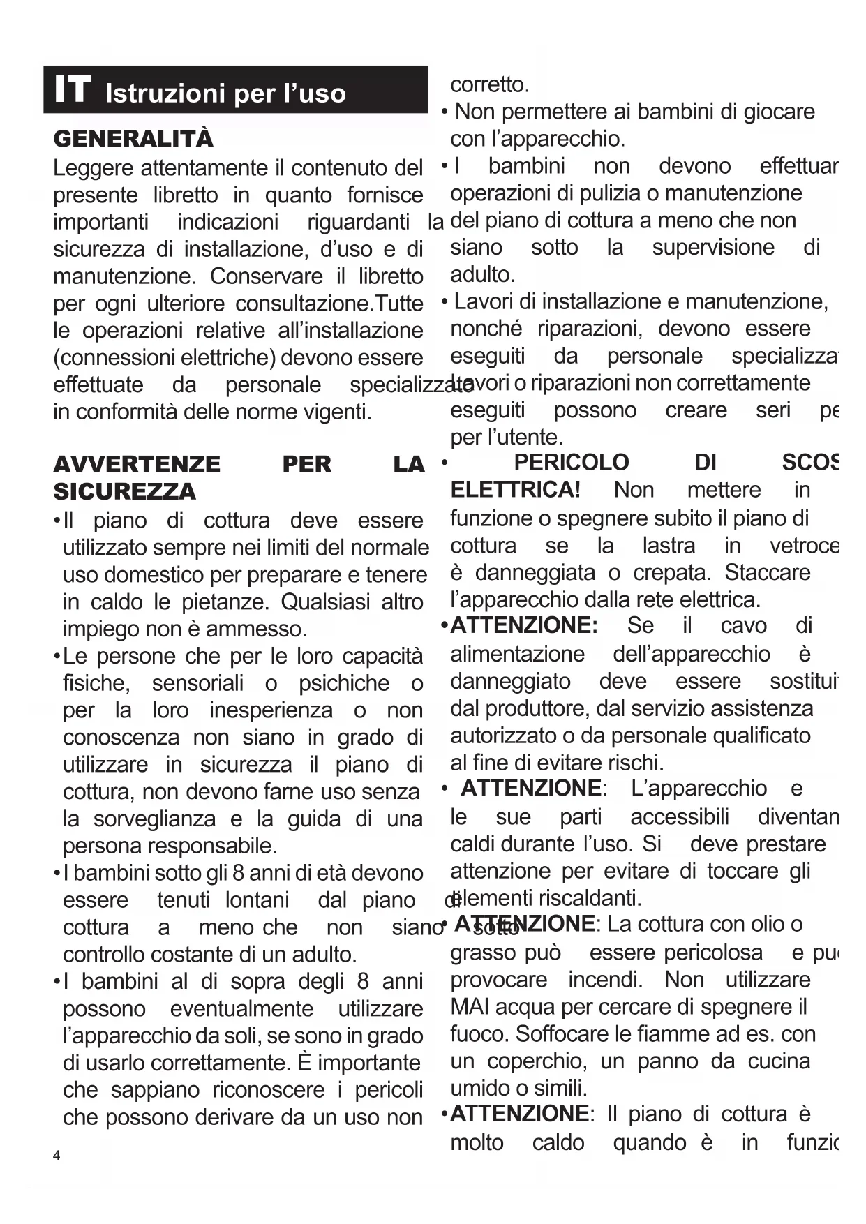 - ATTENZIONE: Il piano di cottura è molto caldo quando è in funzione GENERALITÀ Leggereattentamenteilcontenutodel presente libretto in quanto fornisce importanti indicazioni riguardanti la sicurezza di installazione, d’uso e di manutenzione. Conservare il libretto per ogni ulteriore consultazione.Tutte le operazioni relative all’installazione (connessioni elettriche) devono essere eettuate da personale specializzato in conformità delle norme vigenti.