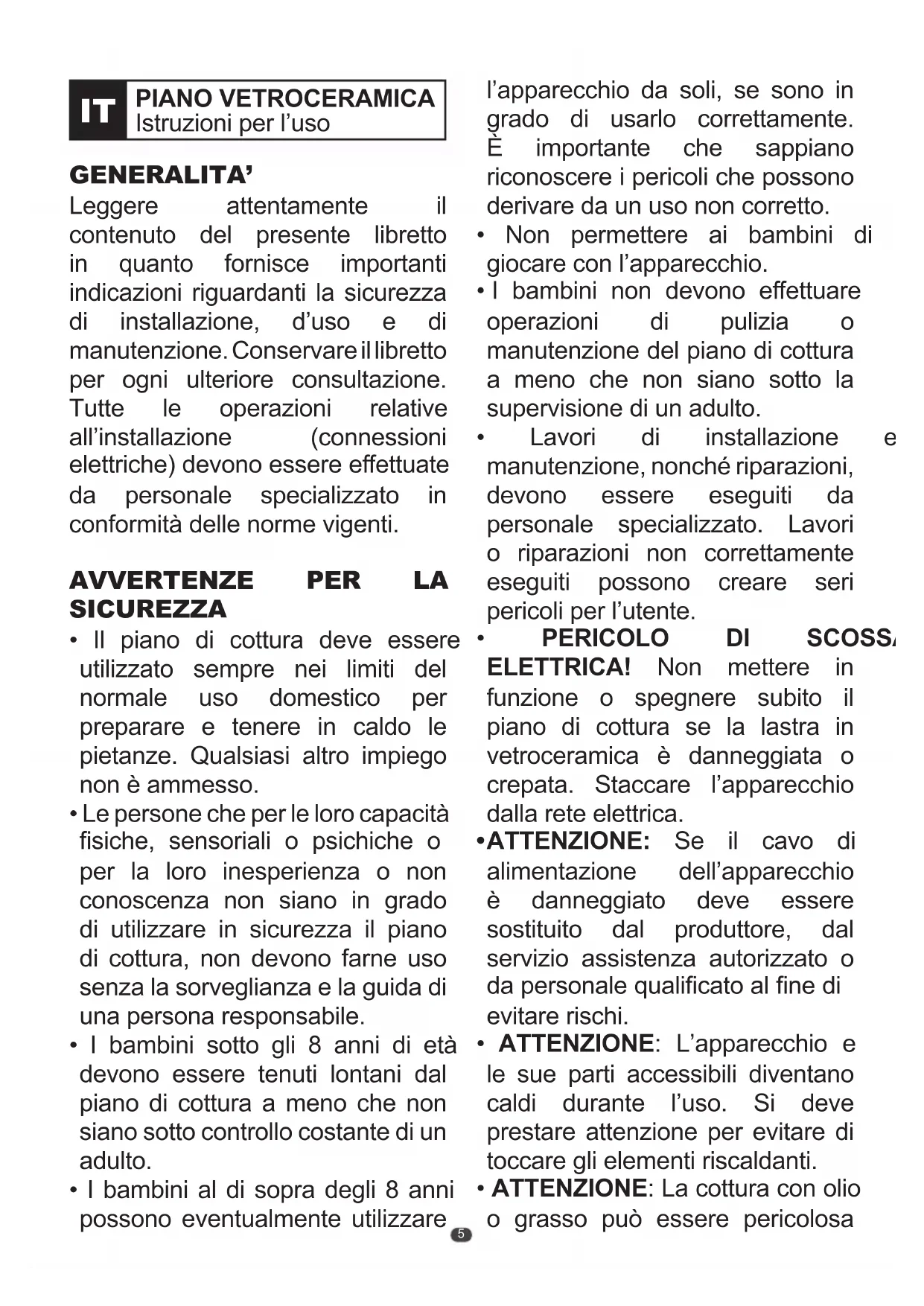 PIANO VETROCERAMICA Istruzioni per l’uso GENERALITA’ Leggere attentamente il contenuto del presente libretto in quanto fornisce importanti indicazioni riguardanti la sicurezza di installazione, d’uso e di manutenzione. Conservare il libretto per ogni ulteriore consultazione. Tutte le operazioni relative all’installazione (connessioni elettriche) devono essere eettuate da personale specializzato in conformità delle norme vigenti.
