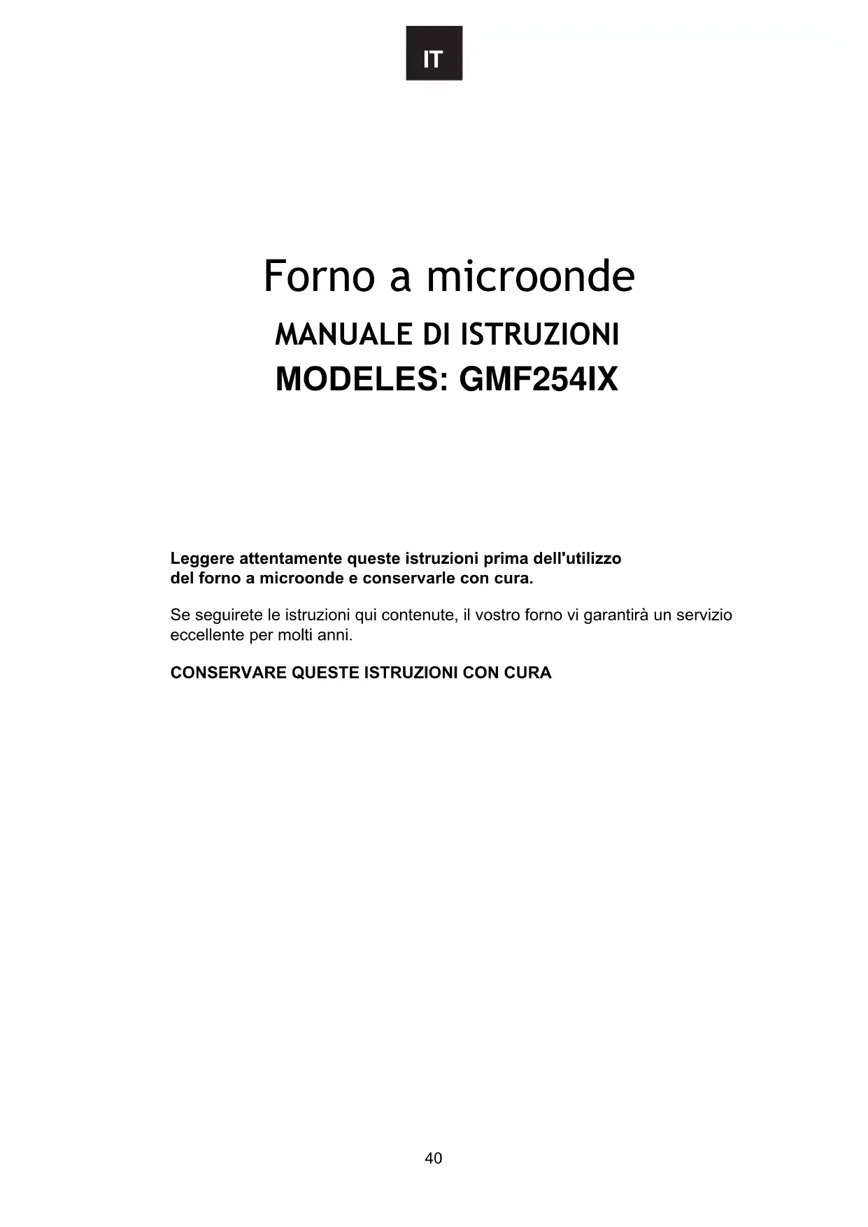 GMF254IX (a) Non tentate di far funzionare il forno con la porta aperta in quanto ciò potrebbe causare una pericolosa esposizione all’energia a microonde. E’ importante non rompere o alterare le chiusure di sicurezza. (b) Non posizionare alcun oggetto tra la parte anteriore del forno e la porta, né lasciar accumulare residui di sporco o di detergenti sulle superfici delle guarnizioni. (c) ATTENZIONE: Se la porta o la guarnizione sono danneggiate, il forno non deve essere utilizzato sino alla sua riparazione da parte di una persona competente. APPENDICE Se l’apparecchio non è mantenuto in buono stato di pulizia, la sua superficie potrebbe essere danneggiata e ciò potrebbe ridurre la durata dell’apparecchio e portare a situazioni pericolose.