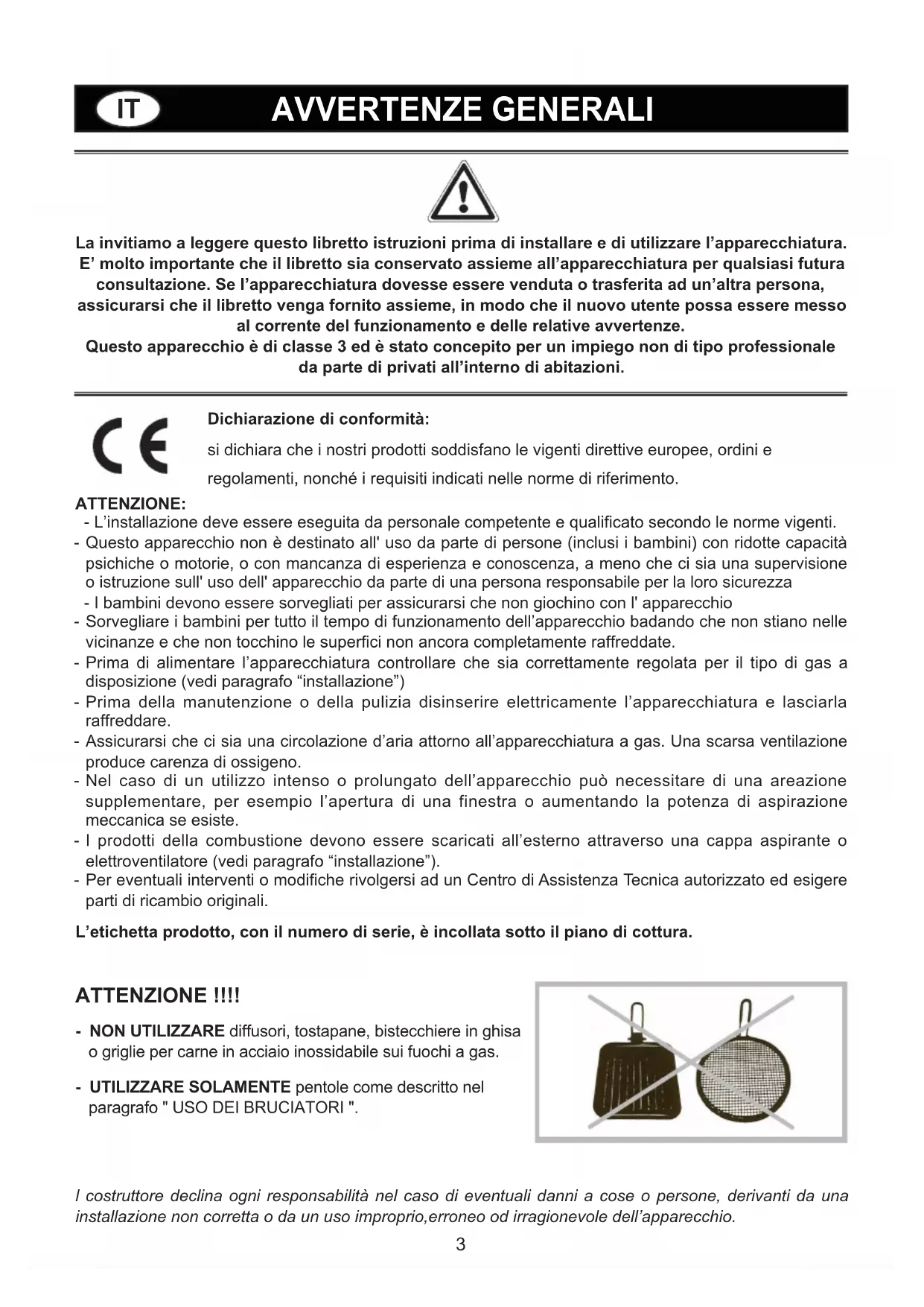 PT3 l costruttore declina ogni responsabilità nel caso di eventuali danni a cose o persone, derivanti da una installazione non corretta o da un uso improprio,erroneo od irragionevole dell’apparecchio. La invitiamo a leggere questo libretto istruzioni prima di installare e di utilizzare l’apparecchiatura. E’ molto importante che il libretto sia conservato assieme all’apparecchiatura per qualsiasi futura consultazione. Se l’apparecchiatura dovesse essere venduta o trasferita ad un’altra persona, assicurarsi che il libretto venga fornito assieme, in modo che il nuovo utente possa essere messo al corrente del funzionamento e delle relative avvertenze. Questo apparecchio è di classe 3 ed è stato concepito per un impiego non di tipo professionale da parte di privati all’interno di abitazioni. ATTENZIONE: - L’installazione deve essere eseguita da personale competente e qualificato secondo le norme vigenti. - Questo apparecchio non è destinato all' uso da parte di persone (inclusi i bambini) con ridotte capacità psichiche o motorie, o con mancanza di esperienza e conoscenza, a meno che ci sia una supervisione o istruzione sull' uso dell' apparecchio da parte di una persona responsabile per la loro sicurezza - I bambini devono essere sorvegliati per assicurarsi che non giochino con l' apparecchio - Sorvegliare i bambini per tutto il tempo di funzionamento dell’apparecchio badando che non stiano nelle vicinanze e che non tocchino le superfici non ancora completamente raffreddate. - Prima di alimentare l’apparecchiatura controllare che sia correttamente regolata per il tipo di gas a disposizione (vedi paragrafo “installazione”) - Prima della manutenzione o della pulizia disinserire elettricamente l’apparecchiatura e lasciarla raffreddare. - Assicurarsi che ci sia una circolazione d’aria attorno all’apparecchiatura a gas. Una scarsa ventilazione produce carenza di ossigeno. - Nel caso di un utilizzo intenso o prolungato dell’apparecchio può necessitare di una areazione supplementare, per esempio l’apertura di una finestra o aumentando la potenza di aspirazione meccanica se esiste. - I prodotti della combustione devono essere scaricati all’esterno attraverso una cappa aspirante o elettroventilatore (vedi paragrafo “installazione”). - Per eventuali interventi o modifiche rivolgersi ad un Centro di Assistenza Tecnica autorizzato ed esigere parti di ricambio originali. L’etichetta prodotto, con il numero di serie, è incollata sotto il piano di cottura.