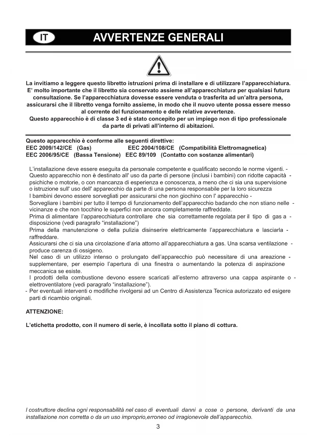 PT23 l costruttore declina ogni responsabilità nel caso di eventuali danni a cose o persone, derivanti da una installazione non corretta o da un uso improprio,erroneo od irragionevole dell’apparecchio. La invitiamo a leggere questo libretto istruzioni prima di installare e di utilizzare l’apparecchiatura. E’ molto importante che il libretto sia conservato assieme all’apparecchiatura per qualsiasi futura consultazione. Se l’apparecchiatura dovesse essere venduta o trasferita ad un’altra persona, assicurarsi che il libretto venga fornito assieme, in modo che il nuovo utente possa essere messo al corrente del funzionamento e delle relative avvertenze. Questo apparecchio è di classe 3 ed è stato concepito per un impiego non di tipo professionale da parte di privati all’interno di abitazioni. Questo apparecchio è conforme alle seguenti direttive: EEC 2009/142/CE (Gas) EEC 2004/108/CE (Compatibilità Elettromagnetica) EEC 2006/95/CE (Bassa Tensione) EEC 89/109 (Contatto con sostanze alimentari) L’installazione deve essere eseguita da personale competente e qualificato secondo le norme vigenti. - Questo apparecchio non è destinato all' uso da parte di persone (inclusi i bambini) con ridotte capacità - psichiche o motorie, o con mancanza di esperienza e conoscenza, a meno che ci sia una supervisione o istruzione sull' uso dell' apparecchio da parte di una persona responsabile per la loro sicurezza I bambini devono essere sorvegliati per assicurarsi che non giochino con l' apparecchio - Sorvegliare i bambini per tutto il tempo di funzionamento dell’apparecchio badando che non stiano nelle - vicinanze e che non tocchino le superfici non ancora completamente raffreddate. Prima di alimentare l’apparecchiatura controllare che sia correttamente regolata per il tipo di gas a - disposizione (vedi paragrafo “installazione”) Prima della manutenzione o della pulizia disinserire elettricamente l’apparecchiatura e lasciarla - raffreddare. Assicurarsi che ci sia una circolazione d’aria attorno all’apparecchiatura a gas. Una scarsa ventilazione - produce carenza di ossigeno. Nel caso di un utilizzo intenso o prolungato dell’apparecchio può necessitare di una areazione - supplementare, per esempio l’apertura di una finestra o aumentando la potenza di aspirazione meccanica se esiste. I prodotti della combustione devono essere scaricati all’esterno attraverso una cappa aspirante o - elettroventilatore (vedi paragrafo “installazione”). Per eventuali interventi o modifiche rivolgersi ad un Centro di Assistenza Tecnica autorizzato ed esigere - parti di ricambio originali. ATTENZIONE: L’etichetta prodotto, con il numero di serie, è incollata sotto il piano di cottura.