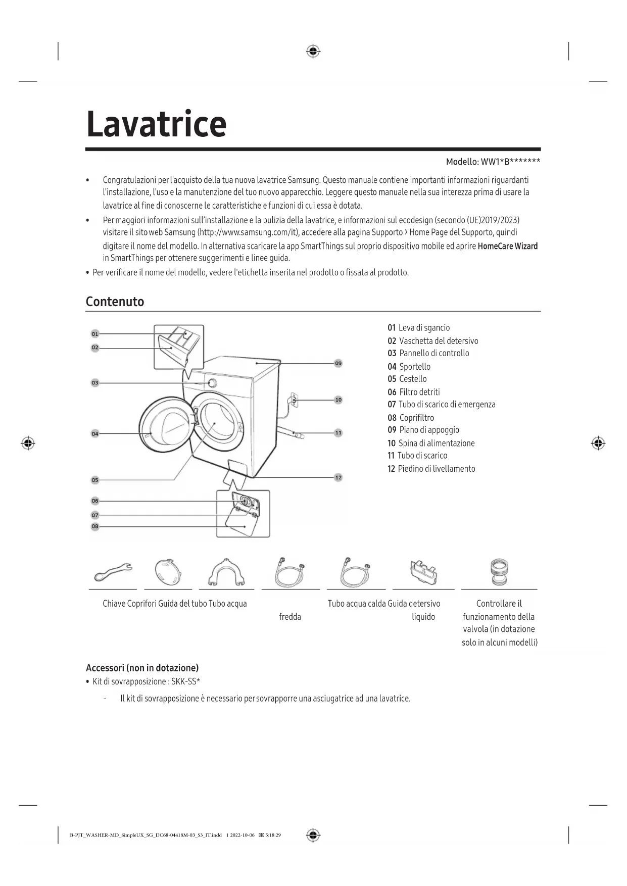 - Kit di sovrapposizione : SKK-SS* ‐ Il kit di sovrapposizione è necessario per sovrapporre una asciugatrice ad una lavatrice. B-PJT_WASHER-MD_SimpleUX_SG_DC68-04418M-03_S3_IT.indd 1 2022-10-06 5:18:29Italiano2 Informazioni di sicurezza NOTA