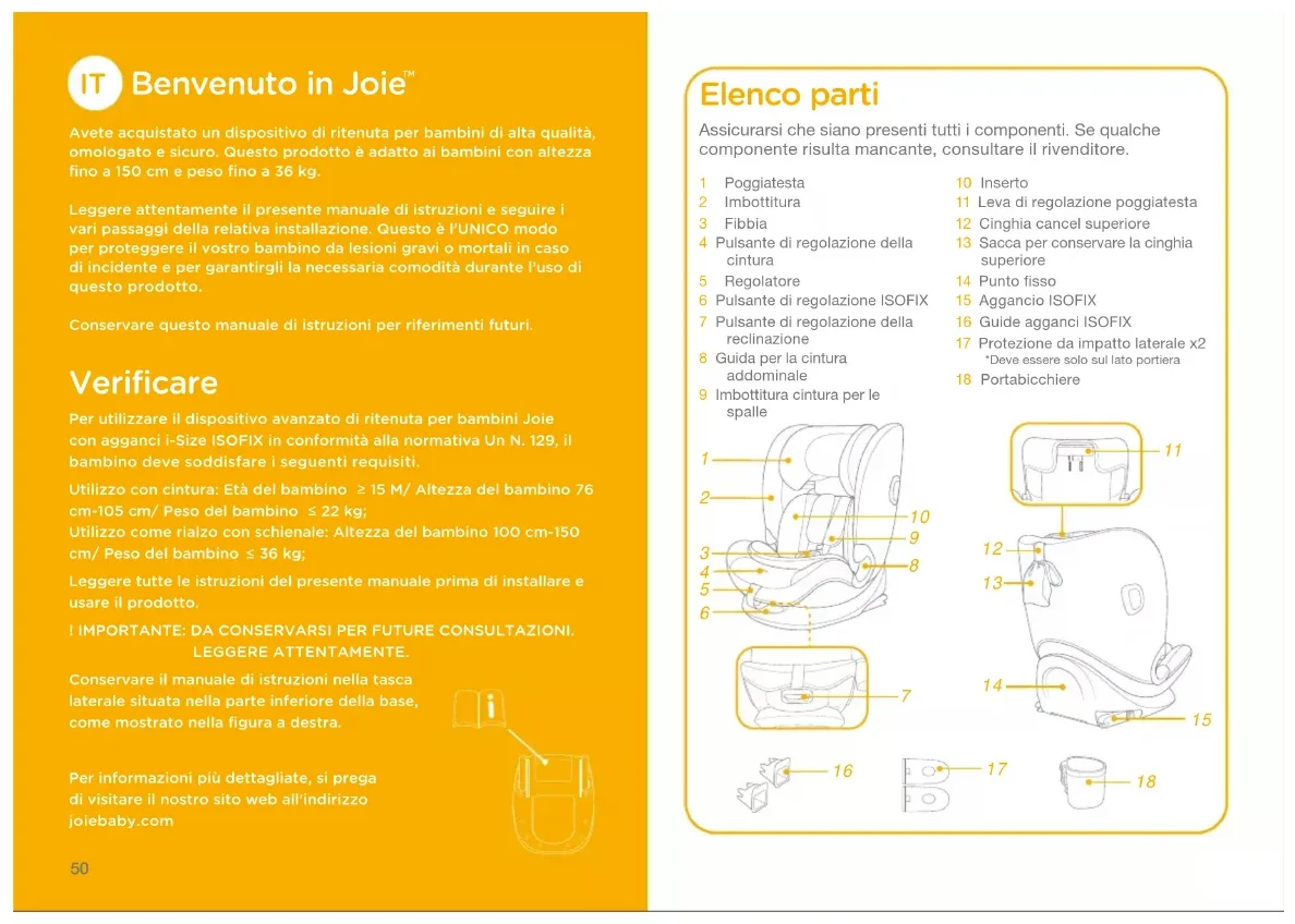 Avete acquistato un dispositivo di ritenuta per bambini di alta qualità﹐ omologato e sicuro. Questo prodotto è adatto ai bambini con altezza fino a 150 cm e peso fino a 36 kg.Leggere attentamente il presente manuale di istruzioni e seguire i vari passaggi della relativa installazione. Questo è l’UNICO modo per proteggere il vostro bambino da lesioni gravi o mortali in caso di incidente e per garantirgli la necessaria comodità durante l’uso di questo prodotto.Conservare questo manuale di istruzioni per riferimenti futuri. Verificare Per utilizzare il dispositivo avanzato di ritenuta per bambini Joie con agganci i-Size ISOFIX in conformità alla normativa Un N. 129﹐ il bambino deve soddisfare i seguenti requisiti.Utilizzo con cintura: Età del bambino 15 M/ Altezza del bambino 76 cm-105 cm/ Peso del bambino 22 kg;Utilizzo come rialzo con schienale: Altezza del bambino 100 cm-150 cm/ Peso del bambino 36 kg;Leggere tutte le istruzioni del presente manuale prima di installare e usare il prodotto.! IMPORTANTE: DA CONSERVARSI PER FUTURE CONSULTAZIONI.LEGGERE ATTENTAMENTE.Conservare il manuale di istruzioni nella tasca laterale situata nella parte inferiore della base﹐ come mostrato nella figura a destra.Per informazioni più dettagliate﹐ si prega di visitare il nostro sito web all'indirizzo joiebaby.com Elenco parti 1 Poggiatesta2 Imbottitura3 Fibbia4 Pulsante di regolazione della cintura5 Regolatore6 Pulsante di regolazione ISOFIX7 Pulsante di regolazione della reclinazione8 Guida per la cintura addominale9 Imbottitura cintura per le spalle10 Inserto11 Leva di regolazione poggiatesta12 Cinghia cancel superiore13 Sacca per conservare la cinghia superiore14 Punto fisso15 Aggancio ISOFIX16 Guide agganci ISOFIX17 Protezione da impatto laterale x2*Deve essere solo sul lato portiera18 PortabicchiereAssicurarsi che siano presenti tutti i componenti. Se qualche componente risulta mancante, consultare il rivenditore.