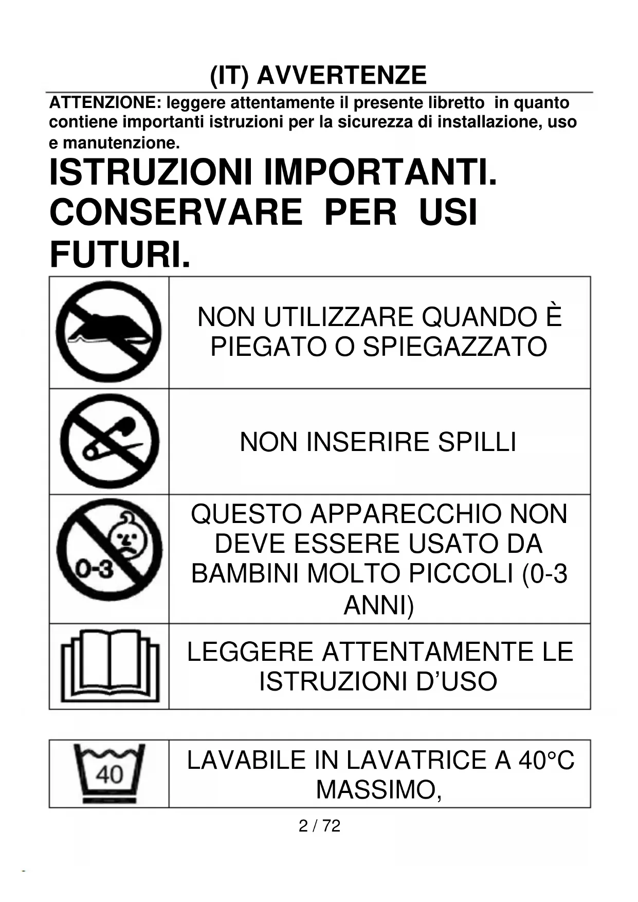 (FR) COUVERTURE ÉLECTRIQUE (supérieure) (DE) ELEKTRISCHE HEIZDECKE (als Überdecke) (ES) MANTA ELÉCTRICA (para colocar encima) (PT) COBERTOR ELÉTRICO (de cima)2 / 72 (IT) AVVERTENZE ATTENZIONE: leggere attentamente il presente libretto in quanto contiene importanti istruzioni per la sicurezza di installazione, uso e manutenzione. ISTRUZIONI IMPORTANTI.
