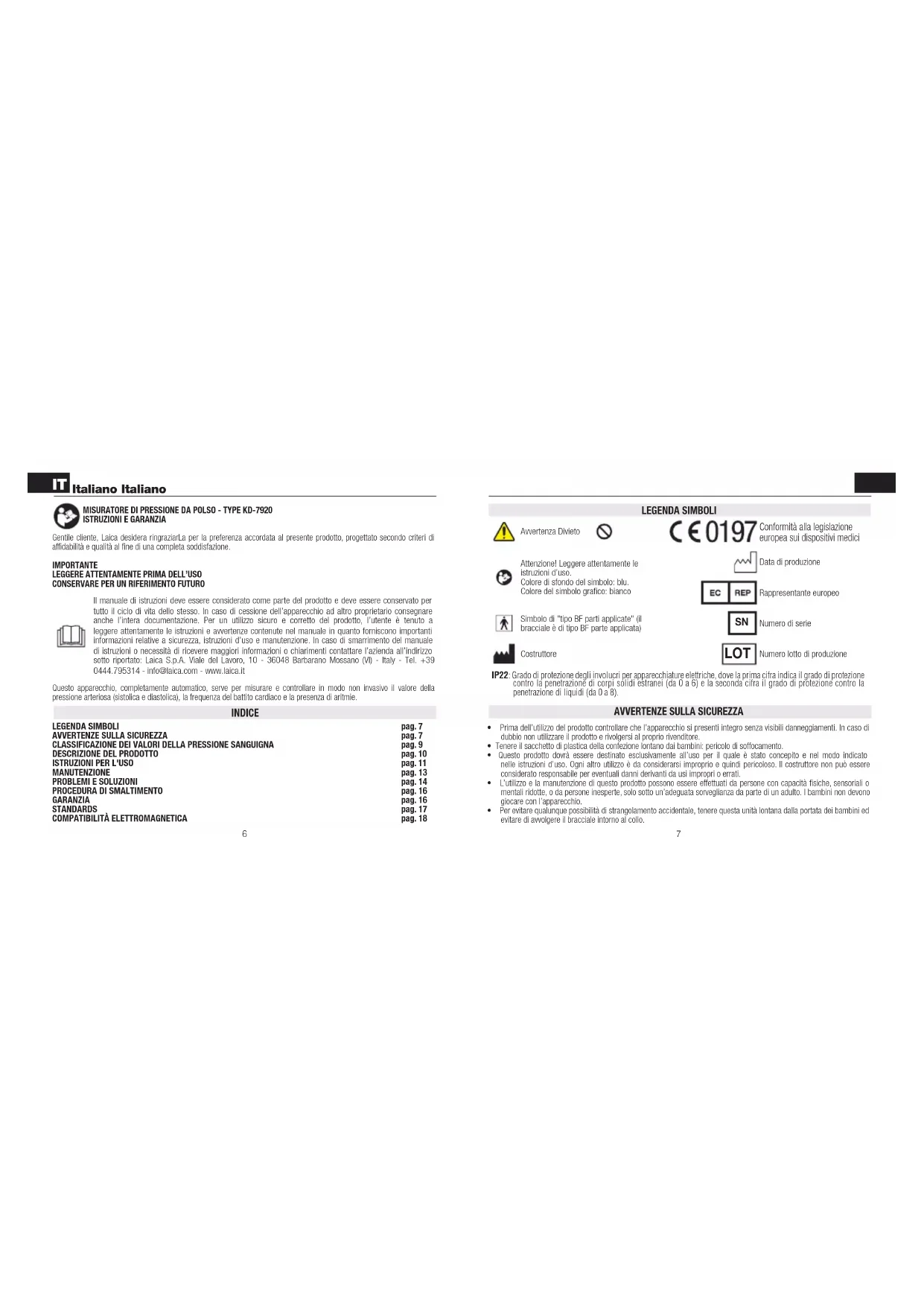MISURATORE DI PRESSIONE DA POLSOMISURATORE DI PRESSIONE DA POLSO 1-2 cm 1-2 cm 1-2 cm Posizione corretta di misurazione Correct reading position Position correcte pour la mensuration Correcta posición de medición Posição correta de medição Korrekte Position der Messung Σωστή θέση για τη μέτρηση Poziţie corectă de măsurare Správná poloha měření Správna poloha merania Helyes mérési pozíciók Avvolgimento bracciale Wrapping the cuff Mise en place du brassard Envolvimiento del brazalete Colocação da braçadeira Umwicklung der Manschette Τύλιγμα του περιβραχιόνιου Înfăşurarea brăţării Ovinutí manžety Ovinutie manžety Mandzsetta feltekerése6 7 IT IT Italiano Italiano MISURATORE DI PRESSIONE DA POLSO - TYPE KD-7920 ISTRUZIONI E GARANZIA Gentile cliente, Laica desidera ringraziarLa per la preferenza accordata al presente prodotto, progettato secondo criteri di affidabilità e qualità al fine di una completa soddisfazione. IMPORTANTELEGGERE ATTENTAMENTE PRIMA DELL’USO CONSERVARE PER UN RIFERIMENTO FUTUROIl manuale di istruzioni deve essere considerato come parte del prodotto e deve essere conservato per tutto il ciclo di vita dello stesso. In caso di cessione dell’apparecchio ad altro proprietario consegnare anche l’intera documentazione. Per un utilizzo sicuro e corretto del prodotto, l’utente è tenuto a leggere attentamente le istruzioni e avvertenze contenute nel manuale in quanto forniscono importanti informazioni relative a sicurezza, istruzioni d’uso e manutenzione. In caso di smarrimento del manuale di istruzioni o necessità di ricevere maggiori informazioni o chiarimenti contattare l’azienda all’indirizzo sotto riportato: Laica S.p.A. Viale del Lavoro, 10 - 36048 Barbarano Mossano (VI) - Italy - Tel. +39 0444.795314 - info@laica.com - www.laica.itQuesto apparecchio, completamente automatico, serve per misurare e controllare in modo non invasivo il valore della pressione arteriosa (sistolica e diastolica), la frequenza del battito cardiaco e la presenza di aritmie. INDICE LEGENDA SIMBOLIAVVERTENZE SULLA SICUREZZACLASSIFICAZIONE DEI VALORI DELLA PRESSIONE SANGUIGNADESCRIZIONE DEL PRODOTTOISTRUZIONI PER L'USOMANUTENZIONE PROBLEMI E SOLUZIONIPROCEDURA DI SMALTIMENTOGARANZIASTANDARDSCOMPATIBILITÀ ELETTROMAGNETICApag. 7pag. 7pag. 9pag. 10pag. 11pag. 13pag. 14pag. 16pag. 16pag. 17pag. 18 LEGENDA SIMBOLI Avvertenza Divieto Conformità alla legislazione europea sui dispositivi medici Attenzione! Leggere attentamente le istruzioni d’uso. Colore di sfondo del simbolo: blu. Colore del simbolo grafico: biancoData di produzioneRappresentante europeoSimbolo di "tipo BF parti applicate" (il bracciale è di tipo BF parte applicata) Numero di serieCostruttore LOT Numero lotto di produzione IP22: Grado di protezione degli involucri per apparecchiature elettriche, dove la prima cifra indica il grado di protezione contro la penetrazione di corpi solidi estranei (da 0 a 6) e la seconda cifra il grado di protezione contro la penetrazione di liquidi (da 0 a 8).