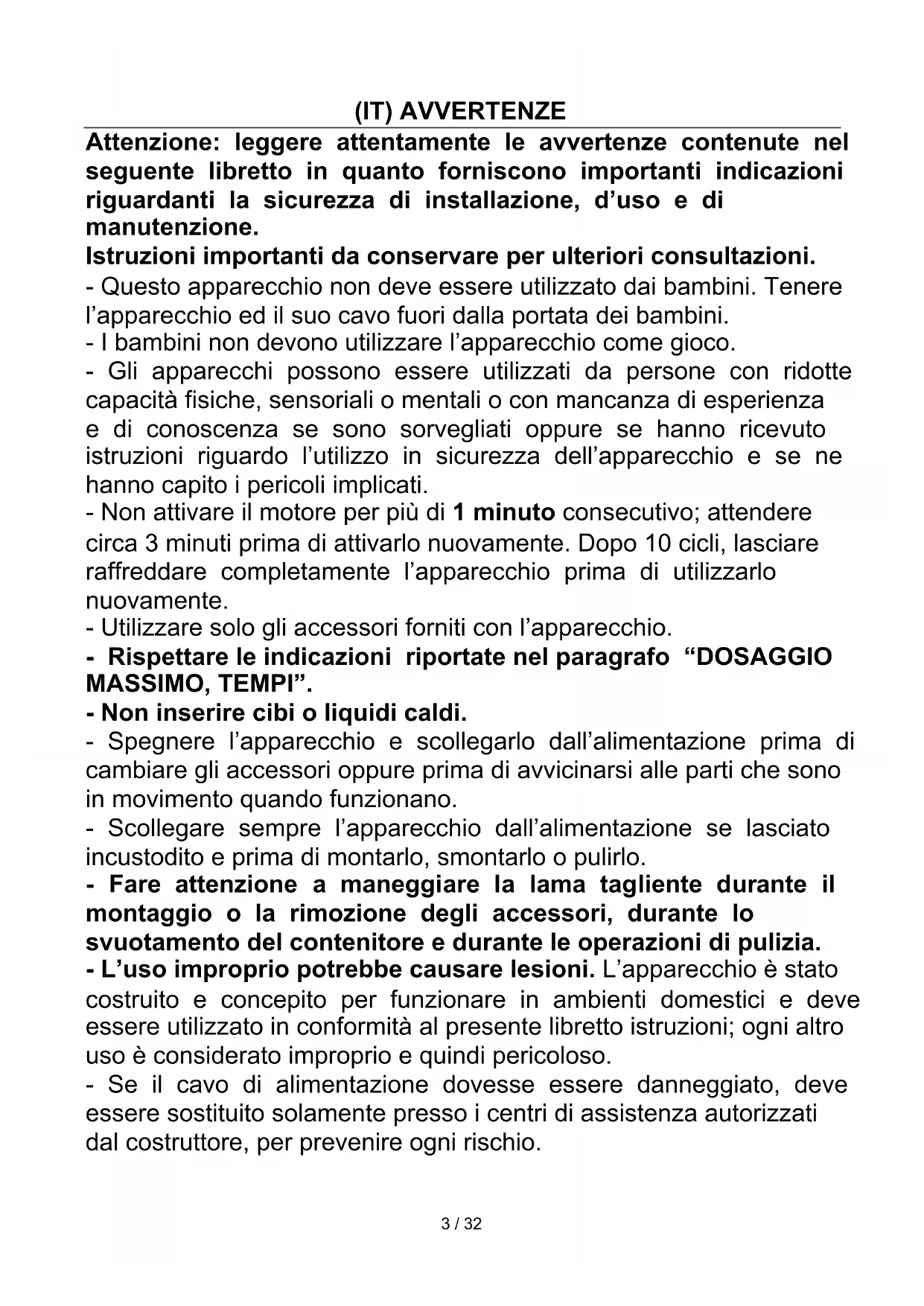 - posizionare la manopola (9) su “0” e scollegare la spina dalla presa di corrente; - rimuovere il contenitore in vetro (3) dal corpo motore (6); - rimuovere il coperchio (2) e versare il preparato. NOTE:7 / 32 ATTENZIONE: rispettare le indicazioni riportate nel paragrafo “DOSAGGIO MASSIMO, TEMPI”. - Per mescolare ingredienti solidi, inserire gradualmente piccole porzioni nel contenitore in vetro attraverso l’apertura nel coperchio (2); non inserire grandi quantità in una volta. - Per mescolare ingredienti soliti, tagliarli in piccoli pezzi (2-3 cm). - Utilizzare la funzione impulso (8) per mescolare ingredienti solidi o altamente viscosi. - Fare funzionare l’apparecchio tenendolo fermo con la mano posizionata sopra il coperchio. - Per preparare piccole quantità di cibo, utilizzare una velocità bassa.