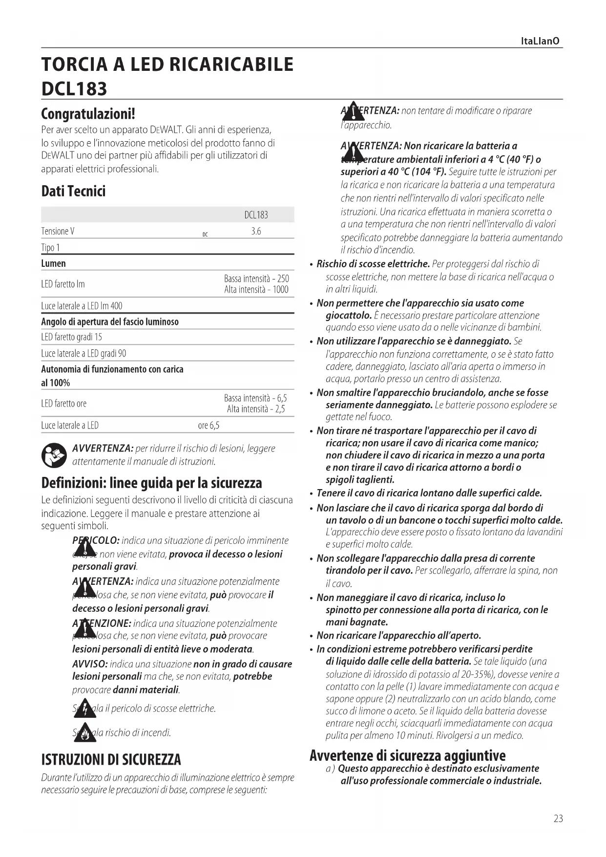 Tipo 1 Lumen LED faretto lm Bassa intensità - 250 Alta intensità - 1000 Luce laterale a LED lm 400 Angolo di apertura del fascio luminoso LED faretto gradi 15 Luce laterale a LED gradi 90 Autonomia di funzionamento con carica al 100% LED faretto ore Bassa intensità - 6,5 Alta intensità - 2,5 Luce laterale a LED ore 6,5 Congratulazioni! Per aver scelto un apparato DeWALT. Gli anni di esperienza, lo sviluppo e l’innovazione meticolosi del prodotto fanno di DeWALT uno dei partner più affidabili per gli utilizzatori di apparati elettriciprofessionali. Dati Tecnici Italiano (tradotto dalle istruzioni originali)