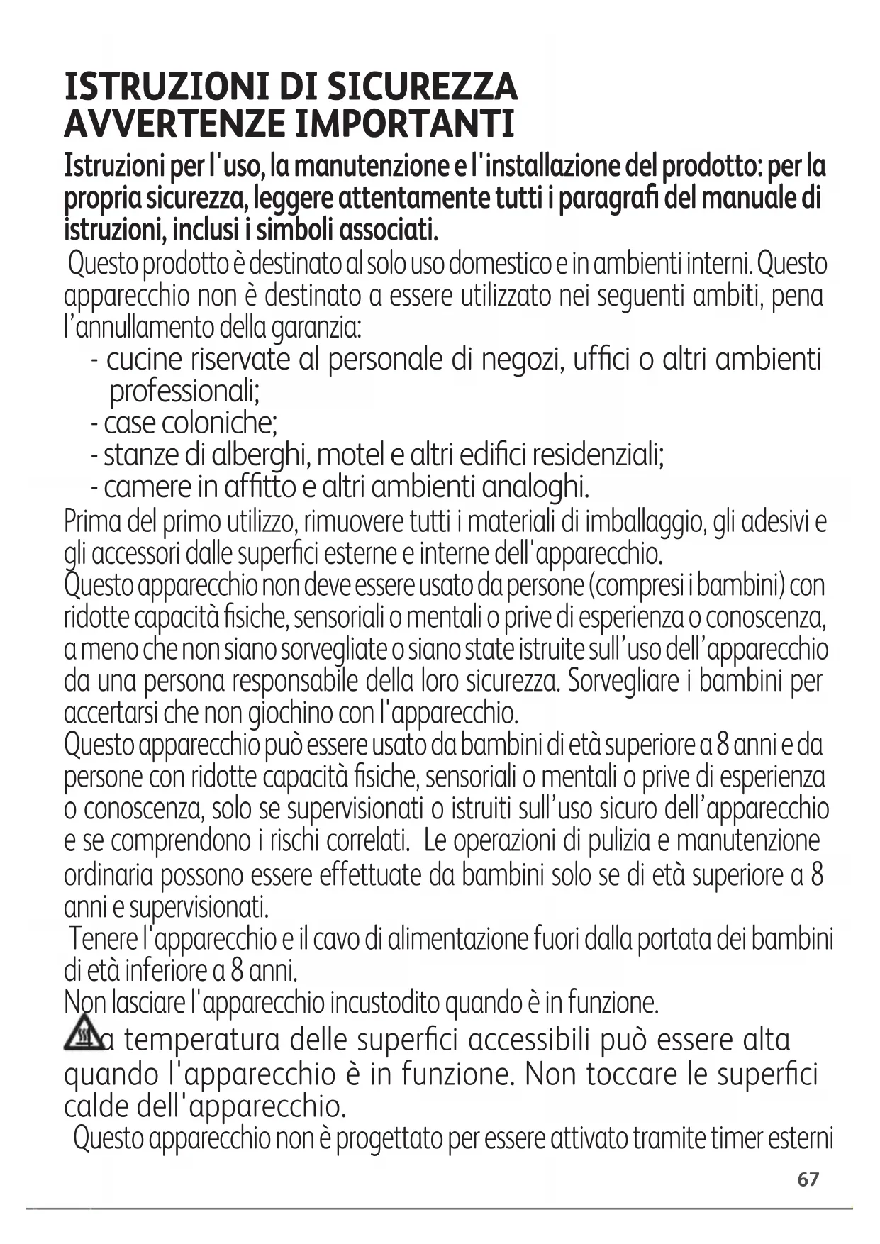 AVVERTENZE IMPORTANTI Istruzioni per l'uso, la manutenzione e l'installazione del prodotto: per la propria sicurezza, leggere attentamente tutti i paragrafi del manuale di istruzioni, inclusi i simboli associati. Questo prodotto è destinato al solo uso domestico e in ambienti interni. Questo apparecchio non è destinato a essere utilizzato nei seguenti ambiti, pena l’annullamento della garanzia: - cucine riservate al personale di negozi, uffici o altri ambienti professionali; - case coloniche; - stanze di alberghi, motel e altri edifici residenziali; - camere in affitto e altri ambienti analoghi. Prima del primo utilizzo, rimuovere tutti i materiali di imballaggio, gli adesivi e gli accessori dalle superfici esterne e interne dell'apparecchio. Questo apparecchio non deve essere usato da persone (compresi i bambini) con ridotte capacità fisiche, sensoriali o mentali o prive di esperienza o conoscenza, a meno che non siano sorvegliate o siano state istruite sull’uso dell’apparecchio da una persona responsabile della loro sicurezza. Sorvegliare i bambini per accertarsi che non giochino con l'apparecchio. Questo apparecchio può essere usato da bambini di età superiore a 8 anni e da persone con ridotte capacità fisiche, sensoriali o mentali o prive di esperienza o conoscenza, solo se supervisionati o istruiti sull’uso sicuro dell’apparecchio e se comprendono i rischi correlati. Le operazioni di pulizia e manutenzione ordinaria possono essere effettuate da bambini solo se di età superiore a 8 anni e supervisionati. Tenere l'apparecchio e il cavo di alimentazione fuori dalla portata dei bambini di età inferiore a 8 anni. Non lasciare l'apparecchio incustodito quando è in funzione. La temperatura delle superfici accessibili può essere alta quando l'apparecchio è in funzione. Non toccare le superfici calde dell'apparecchio. Questo apparecchio non è progettato per essere attivato tramite timer esterni68 o telecomandi separati. Svolgere completamente il cavo di alimentazione prima di collegare l'apparecchio alla presa di corrente. Per motivi di sicurezza, se il cavo di alimentazione è danneggiato deve essere sostituito dal costruttore e dal suo centro di assistenza. Non usare prolunghe elettriche. Se è necessario usare una prolunga, a proprio rischio, usare esclusivamente prolunghe in buone condizioni, dotate di spina con messa a terra e adatte alla potenza dell'apparecchio. Adottare le necessarie precauzioni per evitare che altre persone possano inciampare nel cavo della prolunga. Collegare l'apparecchio esclusivamente a una presa dotata di messa a terra. Assicurarsi che la rete elettrica sia compatibile con la potenza e il voltaggio indicati sulla parte inferiore dell'apparecchio. Per pulire le piastre di cottura, usare una spugna, acqua calda e detersivo per piatti. Non immergere l’apparecchio, il cavo di alimentazione o la spina in acqua o altri liquidi. AVVERTENZA! Non riscaldare o pre-riscaldare l'apparecchio senza le 2 piastre di cottura. Che cosa fare