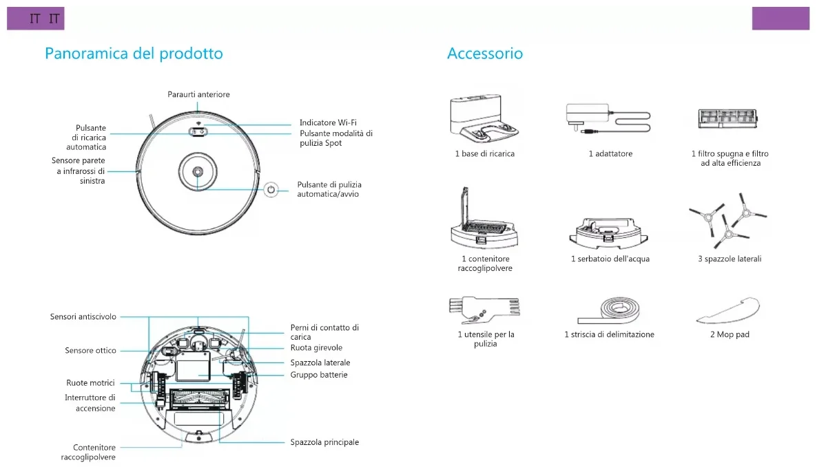Toccare il pulsante Pulizia per avviare la pulizia con il robot. Toccare il pulsante Base per consentire al robot di tornare alla base di ricarica e ricaricarsi. Toccare il pulsante Ventola per selezionare una delle seguenti funzioni di aspirazione: Silenzioso, Standard, Max e Max+. Toccare il pulsante Modalità per selezionare, in base alle proprie esigenze, la modalità di pulizia che si preferisce tra le seguenti: pulizia automatica, pulizia Bordi, pulizia Localizzata e pulizia Casuale. Pulizia automatica: all'inizio di un ciclo di pulizia, il robot eseguirà la mappatura della casa garantendo, così, una pulizia efciente delle zone aperte. Al termine del ciclo di pulizia, il robot tornerà alla base di carica per ricaricarsi. Oppure, se la batteria si scarica prima del termine di un ciclo di pulizia, il robot tornerà automaticamente alla base per ricaricarsi. Il robot può eseguire un ciclo di pulizia no a 150 minuti.IT IT Una volta pulite le zone aperte del pavimento, il robot utilizzerà la modalità Bordi per pulire i bordi lungo le pareti e attorno ai piedi dei mobili. Pulizia Bordi: per impostare una pulizia rapida dei bordi lungo le pareti, è possibile toccare il pulsante di selezione della modalità di pulizia Bordi. Il robot può eseguire un ciclo di pulizia no a 20 minuti. Pulizia Localizzata: il robot esegue una pulizia mirata di un'area predenita, compiendo un movimento a spirale verso l'esterno per circa 1 metro di diametro ed eseguendo poi un movimento a spirale verso l'interno no a tornare al punto di partenza. Il robot può eseguire un ciclo di pulizia no a 2 minuti. Pulizia Casuale: il robot non segue un percorso di pulizia prestabilito. Il robot può eseguire un ciclo di pulizia no a 150 minuti. Pagina principale