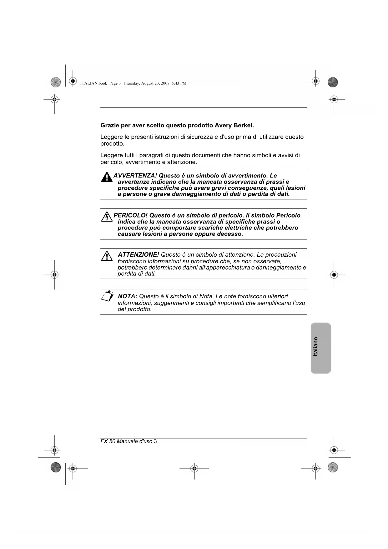 ITALIAN.book Page 2 Thursday, August 23, 2007 5:43 PMItaliano FX 50 Manuale d'uso 3 Grazie per aver scelto questo prodotto Avery Berkel. Leggere le presenti istruzioni di sicurezza e d'uso prima di utilizzare questo prodotto. Leggere tutti i paragrafi di questo documenti che hanno simboli e avvisi di pericolo, avvertimento e attenzione. W AVVERTENZA! Questo è un simbolo di avvertimento. Le avvertenze indicano che la mancata osservanza di prassi e procedure specifiche può avere gravi conseguenze, quali lesioni a persone o grave danneggiamento di dati o perdita di dati. D PERICOLO! Questo è un simbolo di pericolo. Il simbolo Pericolo indica che la mancata osservanza di specifiche prassi o procedure può comportare scariche elettriche che potrebbero causare lesioni a persone oppure decesso. C ATTENZIONE! Questo è un simbolo di attenzione. Le precauzioni forniscono informazioni su procedure che, se non osservate, potrebbero determinare danni all'apparecchiatura o danneggiamento e perdita di dati. N NOTA: Questo è il simbolo di Nota. Le note forniscono ulteriori informazioni, suggerimenti e consigli importanti che semplificano l'uso del prodotto. ITALIAN.book Page 3 Thursday, August 23, 2007 5:43 PMITALIAN.book Page 4 Thursday, August 23, 2007 5:43 PMItaliano