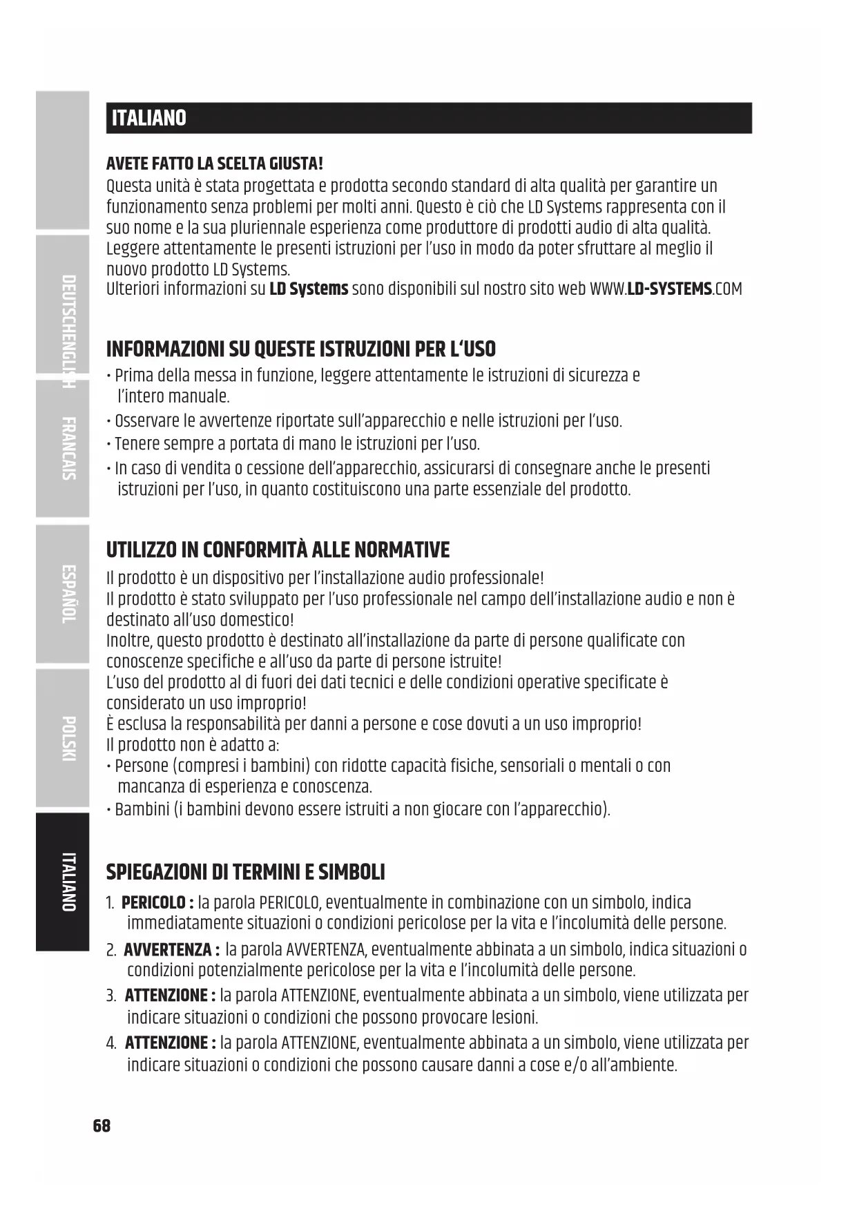 Deklaracje zgodności dla produktów objętych dyrektywami LVD, EMC i RoHS można zamówić na stronie info@adamhall.com. Deklaracje zgodności dla produktów podlegających dyrektywie RED, można uzyskać na stronie www.adamhall.com/compliance/. Pomyłki i błędy, jak również zmiany techniczne lub inne są zastrzeżone! DEUTSCHFRANCAIS ESPAÑOL ENGLISH ITALIANO POLSKI68 ITALIANO AVETE FATTO LA SCELTA GIUSTA! Questa unità è stata progettata e prodotta secondo standard di alta qualità per garantire un funzionamento senza problemi per molti anni. Questo è ciò che LD Systems rappresenta con il suo nome e la sua pluriennale esperienza come produttore di prodotti audio di alta qualità. Leggere attentamente le presenti istruzioni per l’uso in modo da poter sfruttare al meglio il nuovo prodotto LD Systems. Ulteriori informazioni su LD Systems sono disponibili sul nostro sito web WWW.LD-SYSTEMS.COM INFORMAZIONI SU QUESTE ISTRUZIONI PER L‘USO