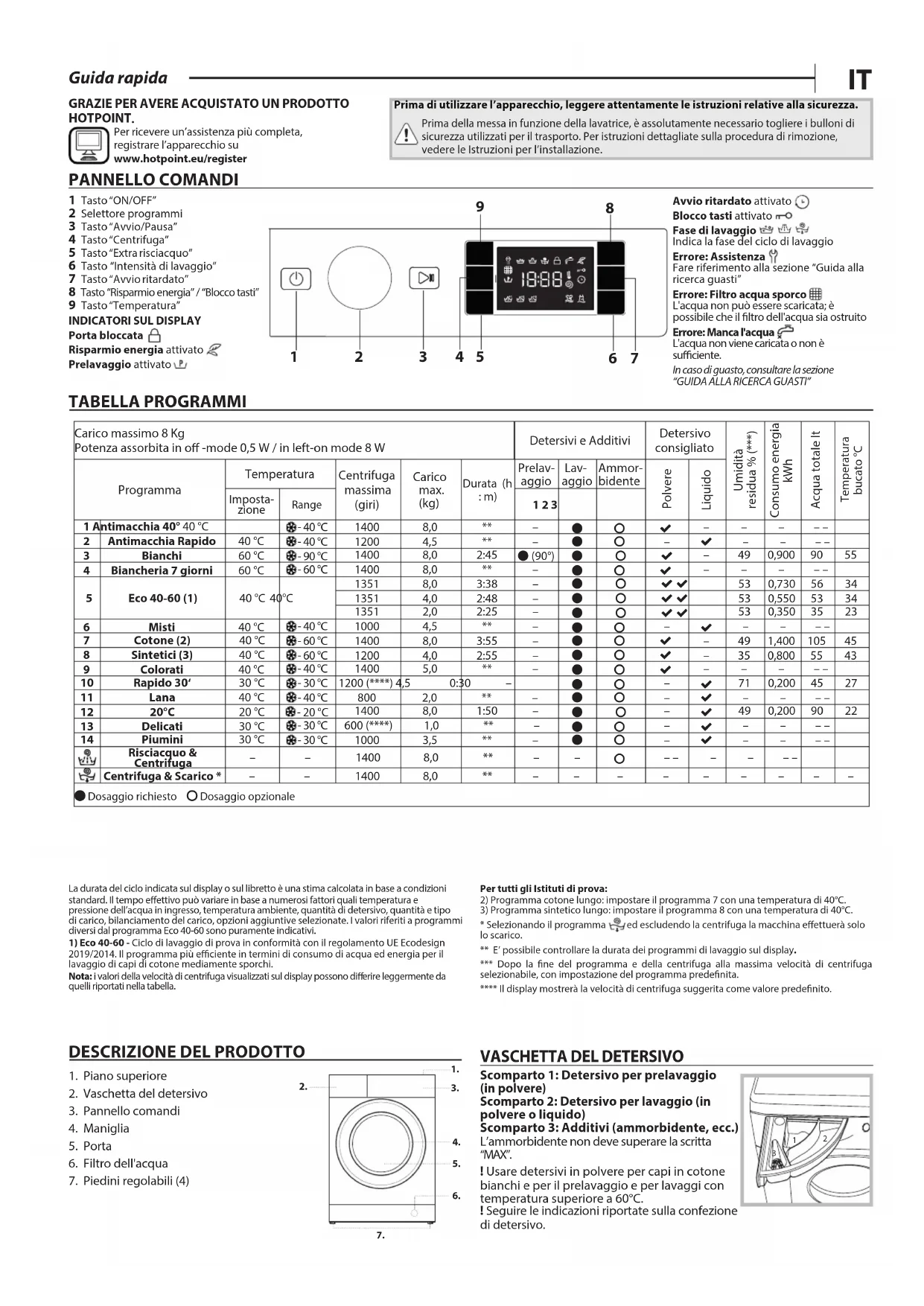 Per ricevere un’assistenza più completa, registrare l’apparecchio su www.hotpoint.eu/registerPrima di utilizzare l’apparecchio, leggere attentamente le istruzioni relative alla sicurezza Prima della messa in funzione della lavatrice, è assolutamente necessario togliere i bulloni di sicurezza utilizzati per il trasporto. Per istruzioni dettagliate sulla procedura di rimozione, vedere le Istruzioni per l’installazione. Carico massimo 8 Kg Potenza assorbita in o -mode 0,5 W / in left-on mode 8 W Detersivi e Additivi Detersivo consigliato Umidità residua % (***) Consumo energia kWh Acqua totale lt Temperatura bucato °C Programma Temperatura Centrifuga massima (giri) Carico max. (kg) Durata (h : m) Prelav- aggio Lav- aggio Ammor- bidente Polvere Liquido Imposta-zione Range 1 2 31 Antimacchia 40° 40 °C- 40 °C1400 8,0 ** – – – – – –2 Antimacchia Rapido 40 °C- 40 °C1200 4,5 ** –