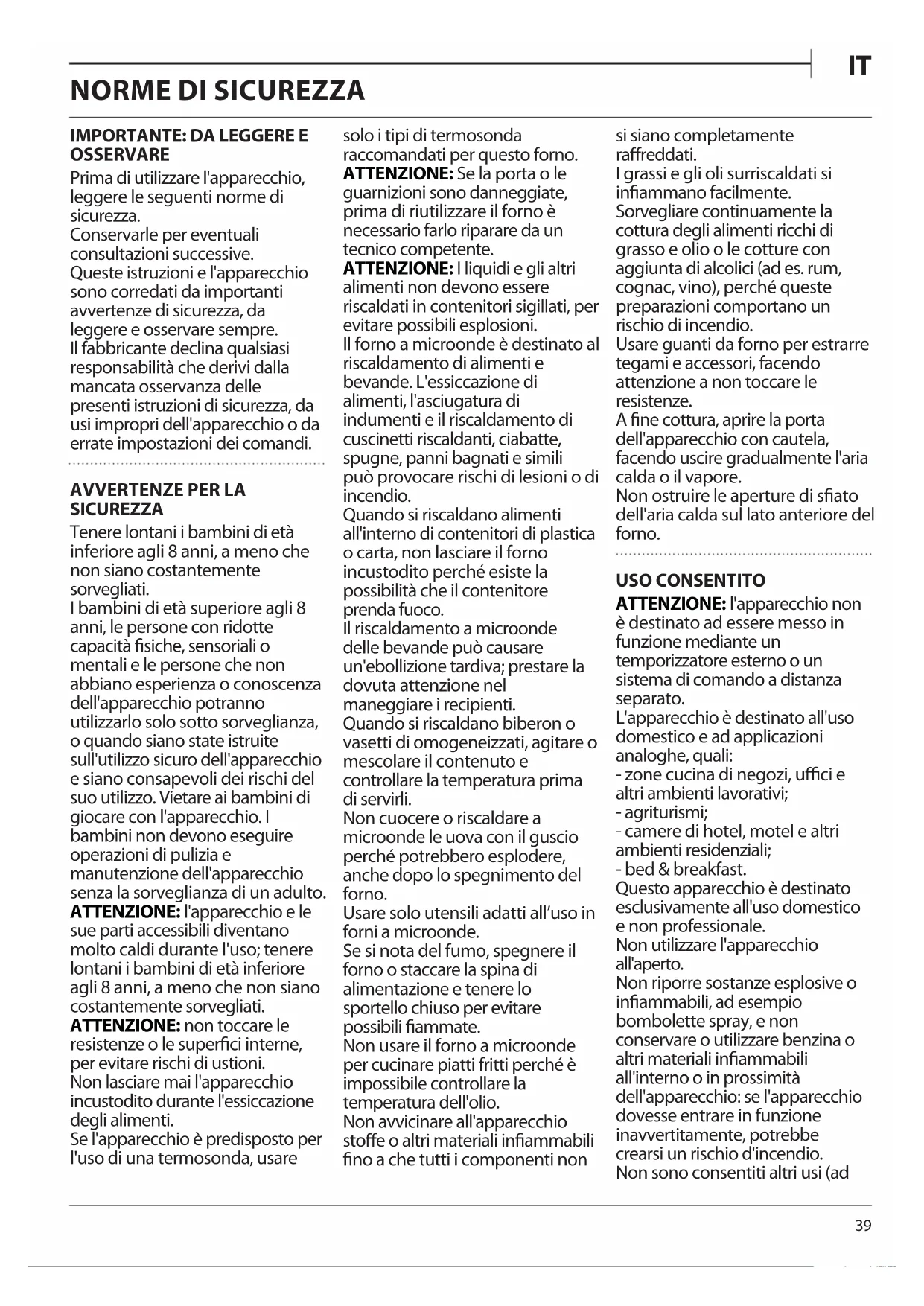 SICUREZZA Tenere lontani i bambini di età inferiore agli 8 anni, a meno che non siano costantemente sorvegliati. I bambini di età superiore agli 8 anni, le persone con ridotte capacità fisiche, sensoriali o mentali e le persone che non abbiano esperienza o conoscenza dell'apparecchio potranno utilizzarlo solo sotto sorveglianza, o quando siano state istruite sull'utilizzo sicuro dell'apparecchio e siano consapevoli dei rischi del suo utilizzo. Vietare ai bambini di giocare con l'apparecchio. I bambini non devono eseguire operazioni di pulizia e manutenzione dell'apparecchio senza la sorveglianza di un adulto. ATTENZIONE: l'apparecchio e le sue parti accessibili diventano molto caldi durante l'uso; tenere lontani i bambini di età inferiore agli 8 anni, a meno che non siano costantemente sorvegliati. ATTENZIONE: non toccare le resistenze o le superfici interne, per evitare rischi di ustioni. Non lasciare mai l'apparecchio incustodito durante l'essiccazione degli alimenti. Se l'apparecchio è predisposto per l'uso di una termosonda, usare solo i tipi di termosonda raccomandati per questo forno. ATTENZIONE: Se la porta o le guarnizioni sono danneggiate, prima di riutilizzare il forno è necessario farlo riparare da un tecnico competente. ATTENZIONE: I liquidi e gli altri alimenti non devono essere riscaldati in contenitori sigillati, per evitare possibili esplosioni. Il forno a microonde è destinato al riscaldamento di alimenti e bevande. L'essiccazione di alimenti, l'asciugatura di indumenti e il riscaldamento di cuscinetti riscaldanti, ciabatte, spugne, panni bagnati e simili può provocare rischi di lesioni o di incendio. Quando si riscaldano alimenti all'interno di contenitori di plastica o carta, non lasciare il forno incustodito perché esiste la possibilità che il contenitore prenda fuoco. Il riscaldamento a microonde delle bevande può causare un'ebollizione tardiva; prestare la dovuta attenzione nel maneggiare i recipienti. Quando si riscaldano biberon o vasetti di omogeneizzati, agitare o mescolare il contenuto e controllare la temperatura prima di servirli. Non cuocere o riscaldare a microonde le uova con il guscio perché potrebbero esplodere, anche dopo lo spegnimento del forno. Usare solo utensili adatti all’uso in forni a microonde. Se si nota del fumo, spegnere il forno o staccare la spina di alimentazione e tenere lo sportello chiuso per evitare possibili fiammate. Non usare il forno a microonde per cucinare piatti fritti perché è impossibile controllare la temperatura dell'olio. Non avvicinare all'apparecchio stoffe o altri materiali infiammabili fino a che tutti i componenti non si siano completamente raffreddati. I grassi e gli oli surriscaldati si infiammano facilmente. Sorvegliare continuamente la cottura degli alimenti ricchi di grasso e olio o le cotture con aggiunta di alcolici (ad es. rum, cognac, vino), perché queste preparazioni comportano un rischio di incendio. Usare guanti da forno per estrarre tegami e accessori, facendo attenzione a non toccare le resistenze. A fine cottura, aprire la porta dell'apparecchio con cautela, facendo uscire gradualmente l'aria calda o il vapore. Non ostruire le aperture di sfiato dell'aria calda sul lato anteriore del forno. USO CONSENTITO ATTENZIONE: l'apparecchio non è destinato ad essere messo in funzione mediante un temporizzatore esterno o un sistema di comando a distanza separato. L'apparecchio è destinato all'uso domestico e ad applicazioni analoghe, quali: - zone cucina di negozi, uffici e altri ambienti lavorativi; - agriturismi; - camere di hotel, motel e altri ambienti residenziali; - bed & breakfast. Questo apparecchio è destinato esclusivamente all'uso domestico e non professionale. Non utilizzare l'apparecchio all'aperto. Non riporre sostanze esplosive o infiammabili, ad esempio bombolette spray, e non conservare o utilizzare benzina o altri materiali infiammabili all'interno o in prossimità dell'apparecchio: se l'apparecchio dovesse entrare in funzione inavvertitamente, potrebbe crearsi un rischio d'incendio. Non sono consentiti altri usi (ad40 esempio, il riscaldamento di ambienti). INSTALLAZIONE La movimentazione e l'installazione dell'apparecchio devono essere effettuate da due o più persone. Usare guanti protettivi per disimballare e installare l'apparecchio. Questo apparecchio è realizzato per l’installazione a incasso. Non utilizzarlo in installazione libera. L'installazione e le riparazioni devono essere eseguite da un tecnico specializzato, in conformità alle istruzioni del produttore e nel rispetto delle norme locali vigenti in materia di sicurezza. Non riparare né sostituire alcuna parte dell'apparecchio a meno che ciò non sia espressamente indicato nel manuale d'uso. Ai bambini non è consentito effettuare operazioni d'installazione. Tenere lontani i bambini durante l'installazione. Tenere il materiale di imballaggio (sacchetti di plastica, parti in polistirene, ecc.) fuori dalla portata dei bambini durante e dopo l'installazione. Dopo aver disimballato l'apparecchio, controllare che l'apparecchio non sia stato danneggiato durante il trasporto. In caso di problemi, contattare il rivenditore o il Servizio Assistenza. Prima di procedere all'installazione, scollegare l'apparecchio dalla rete elettrica. Durante l'installazione, assicurarsi che l'apparecchio non danneggi il cavo di alimentazione. Attivare l'apparecchio solo dopo avere completato la procedura di installazione. La parte inferiore dell'apparecchio non deve più essere accessibile dopo l'installazione. Eseguire tutte le operazioni di taglio del mobile prima di inserire il forno, avendo cura di rimuovere accuratamente trucioli o residui di segatura. Non ostruire lo spazio minimo previsto tra il piano di lavoro e il bordo superiore del forno. Rimuovere il forno dalla base di polistirolo solo al momento dell'installazione. Non installare l'apparecchio dietro un pannello decorativo - possibile rischio di incendio. Dopo aver disimb