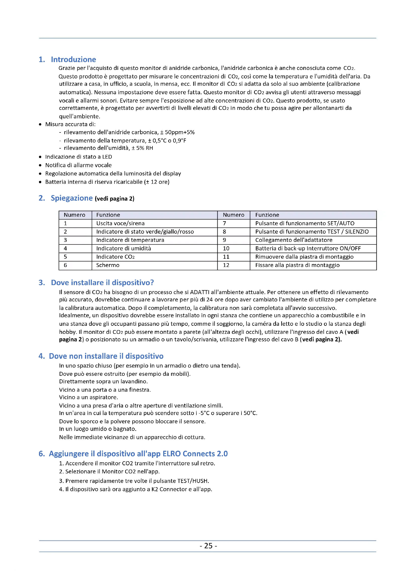 Questo monitor di CO2 è progettato per avvisare l'utente di un accumulo potenzialmente pericoloso di anidride carbonica. Non è progettato per risolvere un problema di anidride carbonica né per localizzare una fonte specifica di anidride carbonica. ELRO non sarà responsabile di pagare per qualsiasi indagine sull'anidride carbonica o chiamata di servizio effettuata o organizzata in risposta ad un allarme. ACCESSORIO - CONNETTORE K2 PER ALLARME DOMESTICO INTELLIGENTE SF50GA Il vostro collegamento all'app ELRO Connects. Il connettore K2 adotta la tecnologia a radiofrequenza (RF) che ha le caratteristiche di basso consumo energetico, alta sicurezza e comunicazioni avanzate tra dispositivi RF e permette di formare un sistema intelligente con i nostri altri prodotti RF, come: Allarmi fumo, allarmi monossido di carbonio, monitor CO2, allarmi calore e acqua, sensori porta-finestra, sensori di movimento, prese di corrente ecc. ecc.