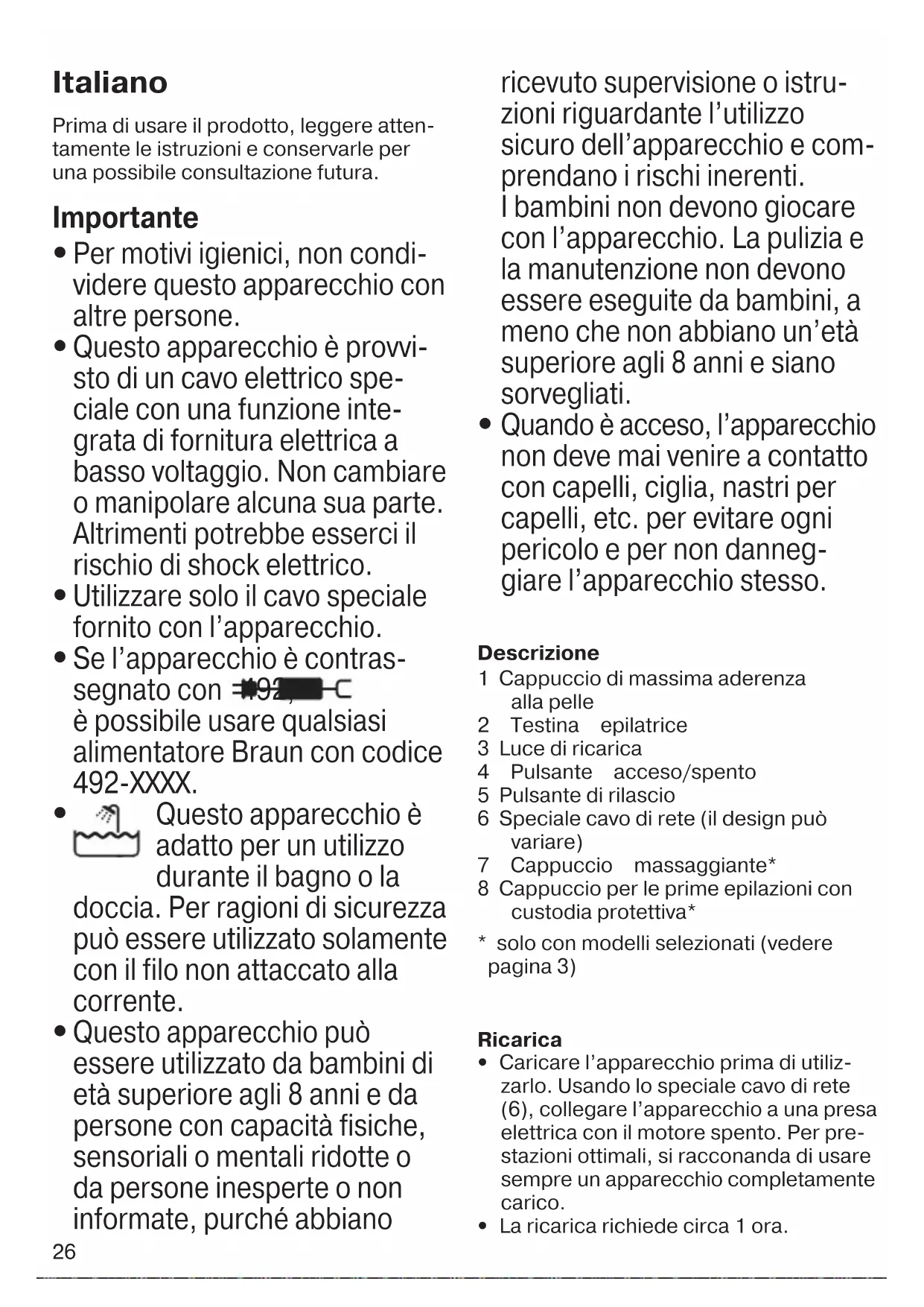 Se l’apparecchio è contras- segnato con 492, è possibile usare qualsiasi alimentatore Braun con codice 492-XXXX.