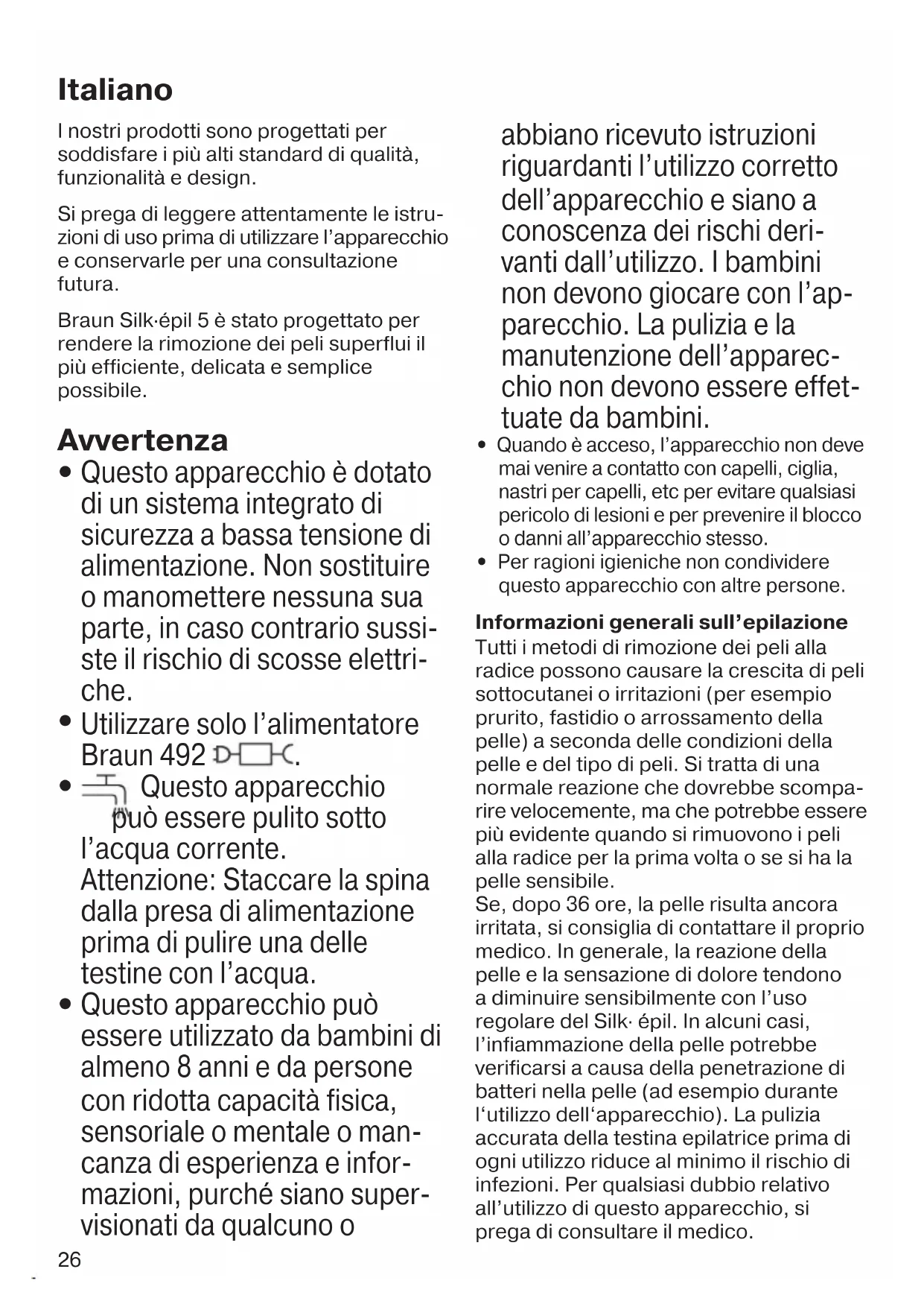 è inoltre possibile consegnare gratuitamente, senza obbligo di acquisto, i prodotti elettronici da smaltire con dimensioni inferiori a 25 cm. L’adeguata raccolta differenziata per l’avvio successivo dell’apparecchiatura dismessa al riciclaggio, al trattamento e allo smaltimento ambientalmente com- patibile contribuisce ad evitare possibili effetti negativi sull’ambiente e sulla salute e favorisce il reimpiego e/o riciclo dei materiali di cui è composta l’apparec- chiatura. Soggetto a modifica senza preavviso. Garanzia Braun fornisce una garanzia valevole per la durata di 2 anni dalla data di acquisto. Nel periodo di garanzia verranno eliminati, gratuitamente, i guasti dell’apparecchio conseguenti a difetti di fabbrica o di materiali, sia riparando il prodotto sia sostituendo, se necessario, l’intero apparecchio. Tale garanzia non copre: danni derivanti dall’uso improprio del prodotto, la normale usura conseguente al funzionamento dello stesso, i difetti che hanno un effetto trascurabile sul valore o sul funzionamento dell’apparecchio. La garanzia decade se vengono effettuate riparazioni da soggetti non autorizzati o con parti non originali Braun. Per accedere al servizio durante il periodo di garanzia, è necessario consegnare o far pervenire il prodotto integro, insieme allo scontrino di acquisto, ad un Centro di Assistenza autorizzato Braun. Contattare www.service.braun.com o il numero 800 440 017 per avere informazioni sul Centro di Assistenza autorizzato Braun più vicino. 90340813_SE5_Power_MN.indd 2990340813_SE5_Power_MN.indd 29 02.06.22 10:4902.06.22 10:4930 Onze producten voldoen aan de hoogste eisen van kwaliteit, functionaliteit en design. Wijwensen u veelplezier met uw Braun Silk·épil 5. In deze gebruiksaanwijzing willen wij u vertrouwd maken met het apparaat en u voorzien van nuttige informatie over epileren. Lees eerst zorgvuldig de hele gebruiksaanwijzing voordat u het appa- raat gebruikt. Braun Silk·épil 5 is ontworpen om het verwijderen van haartjes zo efficiënt, zacht en makkelijk mogelijk te maken. Waarschuwing