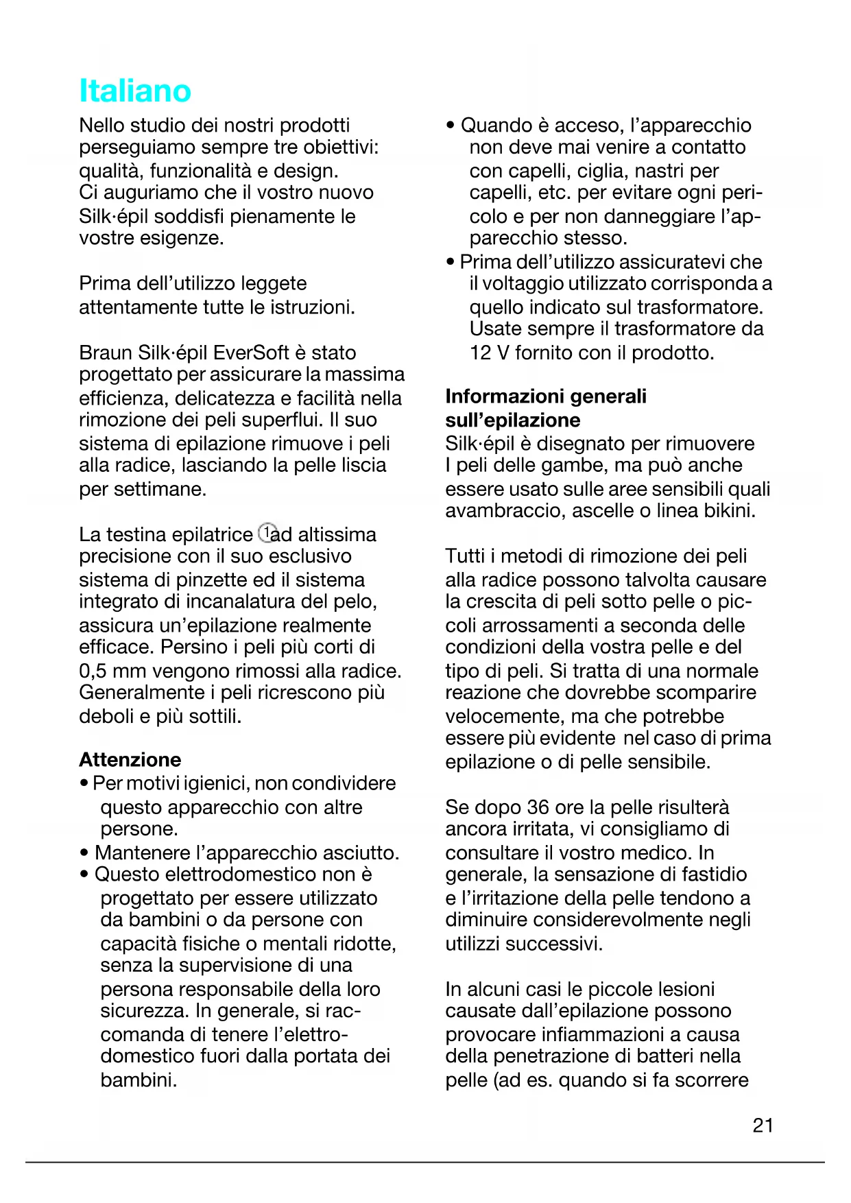 5366377_SE2180_P6-52 Seite 20 Donnerstag, 13. Dezember 2007 3:39 1521 Italiano Nello studio dei nostri prodotti perseguiamo sempre tre obiettivi: qualità, funzionalità e design. Ci auguriamo che il vostro nuovo Silk·épil soddisfi pienamente le vostre esigenze. Prima dell’utilizzo leggete attentamente tutte le istruzioni. Braun Silk·épil EverSoft è stato progettato per assicurare la massima efficienza, delicatezza e facilità nella rimozione dei peli superflui. Il suo sistema di epilazione rimuove i peli alla radice, lasciando la pelle liscia per settimane. La testina epilatrice ad altissima precisione con il suo esclusivo sistema di pinzette ed il sistema integrato di incanalatura del pelo, assicura un’epilazione realmente efficace. Persino i peli più corti di 0,5 mm vengono rimossi alla radice. Generalmente i peli ricrescono più deboli e più sottili. Attenzione